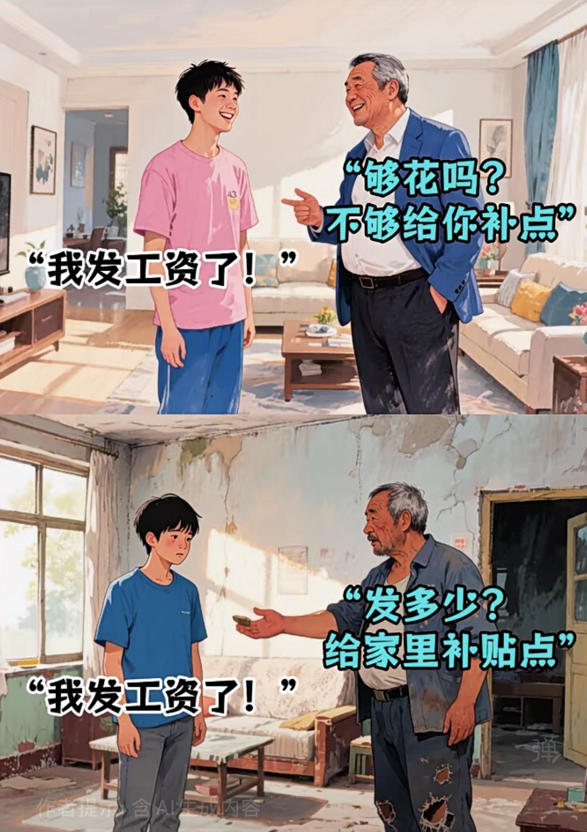 家境有别,父爱无差 1. 话语里的爱,从未分贫富 优渥的生活里,父亲一句“别委屈自己,该吃吃该花花”,是把宠溺揉进日常;平凡的日子中,父亲一句“平时省着点,别老是乱花钱”,是把心疼藏进叮嘱。看似相反的话,却都是父爱的真心流露。 2. 薪水里的盼,皆是家的暖 拿到工资时,富裕的父亲问“够花吗?不够给你补点”,是想为孩子兜底;普通的父亲说“发多少?给家里补贴点”,是盼着日子能好一点。不同的问句背后,都是对家的牵挂。 3. 人生里的托,从来无保留 谈婚论嫁时,条件好的父亲拍着胸脯说“房、车、彩礼都不是问题”,是给孩子最大的底气;处境普通的父亲着急念叨“你都多大了,还不结婚”,是盼着孩子能有归宿。父爱从不会因家境打折,只会倾尽所有为孩子着想。
