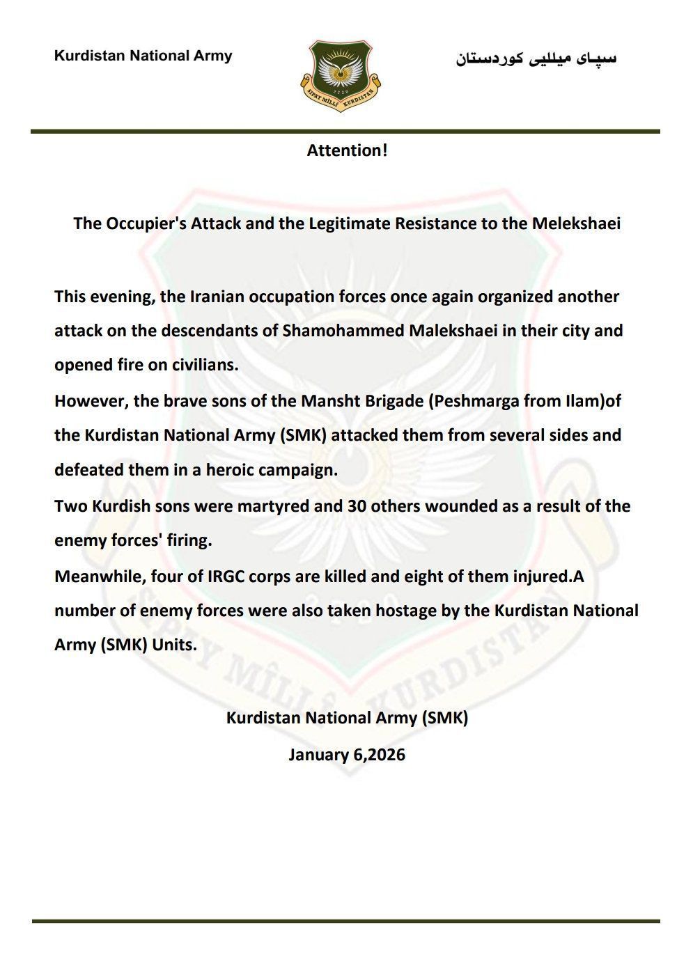 伊朗的“库尔德国民军”向伊朗伊斯兰政权部队宣战伊朗的库尔德斯坦国民军(SMK)发表官方声明,确认在马利克沙希发生针对平民的袭击后,已对伊朗政权部队进行全面开战。声明称,伊朗占领军向该地区平民开火。包括来自伊拉姆省(伊兰省)的库尔德武装和佩什梅加在内的库尔德武装从多个方向予以还击。据报道,冲突造成库尔德人伤亡,数十人受伤,多名伊斯兰革命卫队成员死伤,另有多名伊朗伊斯兰政权部队成员被俘。声明将此次行动描述为对德黑兰政权在库尔德人控制区持续镇压的回应。