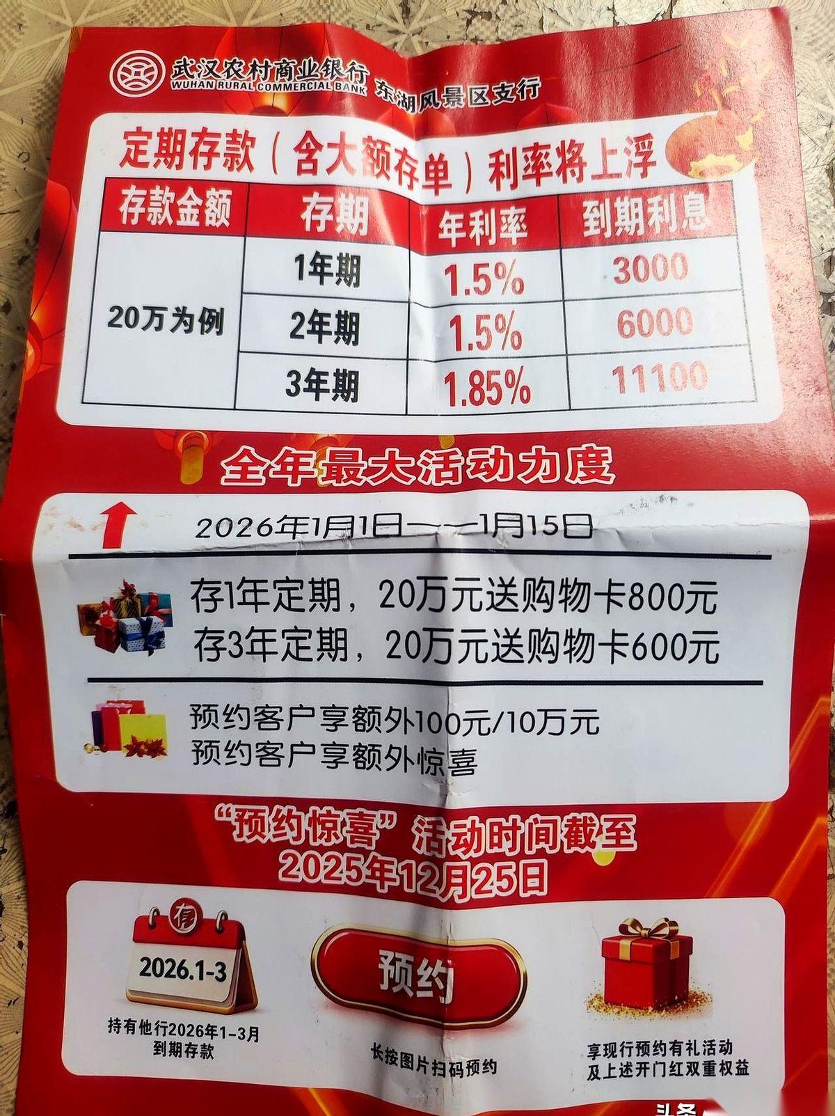 今天但凡我脑子慢半拍,我那20万,可能就变成了一份不知道猴年马月才能取的“保险”。 真的,后背现在都还有点发凉。 跟老婆跑了几家大银行,利率低得让人心疼,感觉钱放进去不是在理财,是在做慈善。后来路过一家农商行,想着小银行可能为了拉存款,会大方点。 进去一问,果然“惊喜”。 工作人员特热情,递上宣传单,说20万存三年,年利率1.85%。 我心里盘算了一下,三年下来一万多的利息,还行啊,比那几个大行强多了。 就在我准备点头办手续的时候,脑子里突然“嗡”地一下。 不对劲。 这个数字,太“恰到好处”了。高得让你心动,但又没高到离谱让你一眼识破。 这不就是网上说的那些套路吗? 我立马刹车,看着工作人员的笑脸,突然觉得那笑容背后全是KPI。我问了句:“这是纯存款吧?不是什么理财或者保险产品吧?” 对方虽然满口保证是存款,但我已经不敢信了。 这个年头,最可怕的不是利息高低,而是你以为你在存钱,其实别人在卖你一份十年期的合约。 最后找了个借口,说回去跟家人商量一下,赶紧拉着老婆溜了。 哎,你说这事儿整的。 我们普通老百姓,就想安安稳稳存点钱,怎么就跟玩扫雷游戏一样,步步惊心呢?