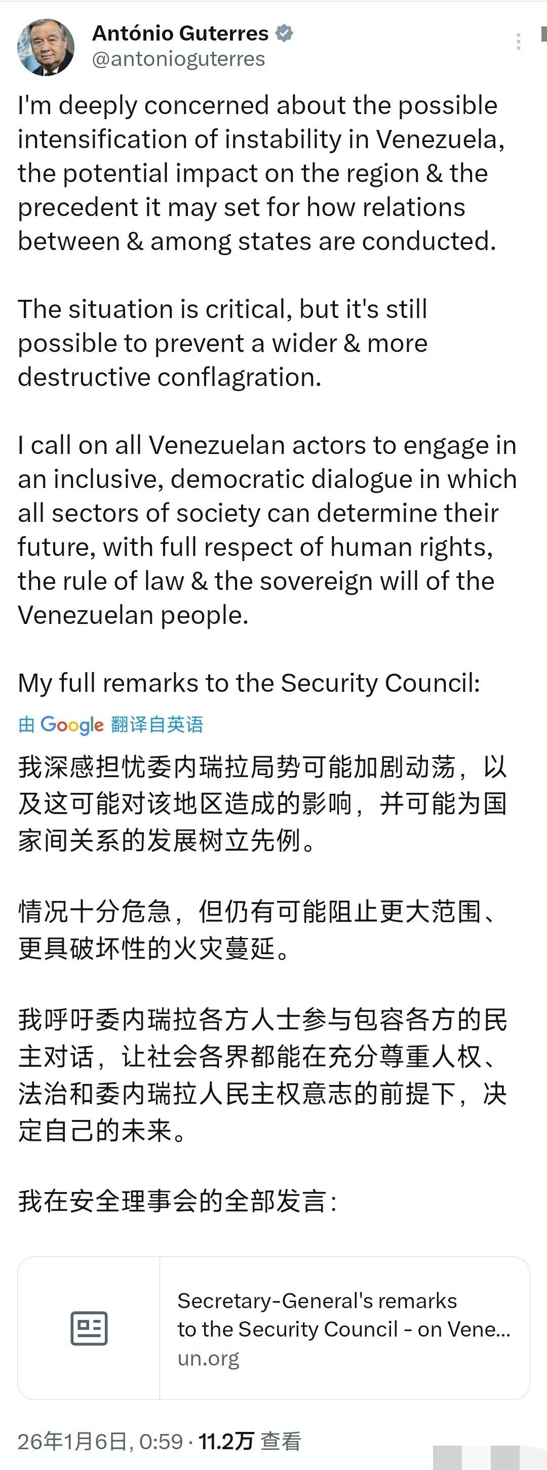联合国如同摆设,竟不敢谴责美国侵略委内瑞拉! 联合国秘书长古特雷斯在联合国的发言令人失望。身为联合国代表,他对美国入侵委内瑞拉的侵略行径不敢谴责,反倒去指责委内瑞拉不够配合,这得有多荒唐可笑呀! 他说道:我深感忧虑,委内瑞拉局势有加剧动荡的可能,这或许会对该地区产生影响,还可能为国家间关系的发展树立不良先例。 局势十分危急,但仍有可能阻止更大范围、更具破坏力的危机蔓延。 我呼吁委内瑞拉各方人士参与包容广泛的民主对话,让社会各界都能在充分尊重人权、法治和委内瑞拉人民意愿的基础上决定自己的未来。 真是拉垮呀,对美国的入侵只字不提,但对委内瑞拉的要求倒是不少。联合国是主持正义,扶正祛邪的组织,得在这上面发挥联合国的作用,为世界公平正义和平稳定发声,而不是谁强谁胳膊粗就听谁的,如果联合国都不去坚守公平正义的底线,那它存在的意义又何在呢? 美国以所谓“民主”“人权”为幌子,肆意对委内瑞拉进行军事干预和经济制裁,其背后不过是为了谋取委内瑞拉丰富的石油资源和地缘政治利益。而联合国在这样的恶行面前,却表现得如此软弱无力,这无疑是对国际秩序的公然践踏。 我们不禁要问,难道正义就真的无法战胜强权吗?联合国不能再这样沉默下去了,它应该拿出应有的勇气和担当,对美国的侵略行为进行严厉的谴责和制裁。各国也应该团结起来,共同抵制美国的霸权主义行径,让世界重新回到和平、公平、正义的轨道上来。否则,联合国将彻底沦为美国等西方国家的工具,而世界也将陷入更加混乱和无序的深渊。