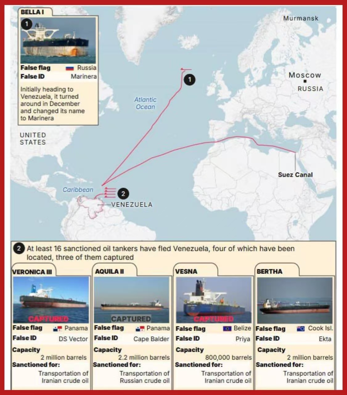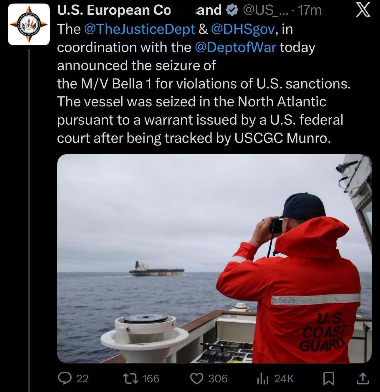 美军欧洲司令部确认,已在大西洋公海上扣留了俄罗斯油轮“水手号”。美军绑架油轮的行动得到了美空军KC-135T 加油机、P-8A"海神"巡逻机和英国"海神"MRA1巡逻机的支持,包括皮拉图斯U-28A "天龙"在内的几架美国特种用途飞机也参与了行动区域。美方扣押贝拉1号油轮美在北大西洋扣押油轮委内瑞拉发布讣告