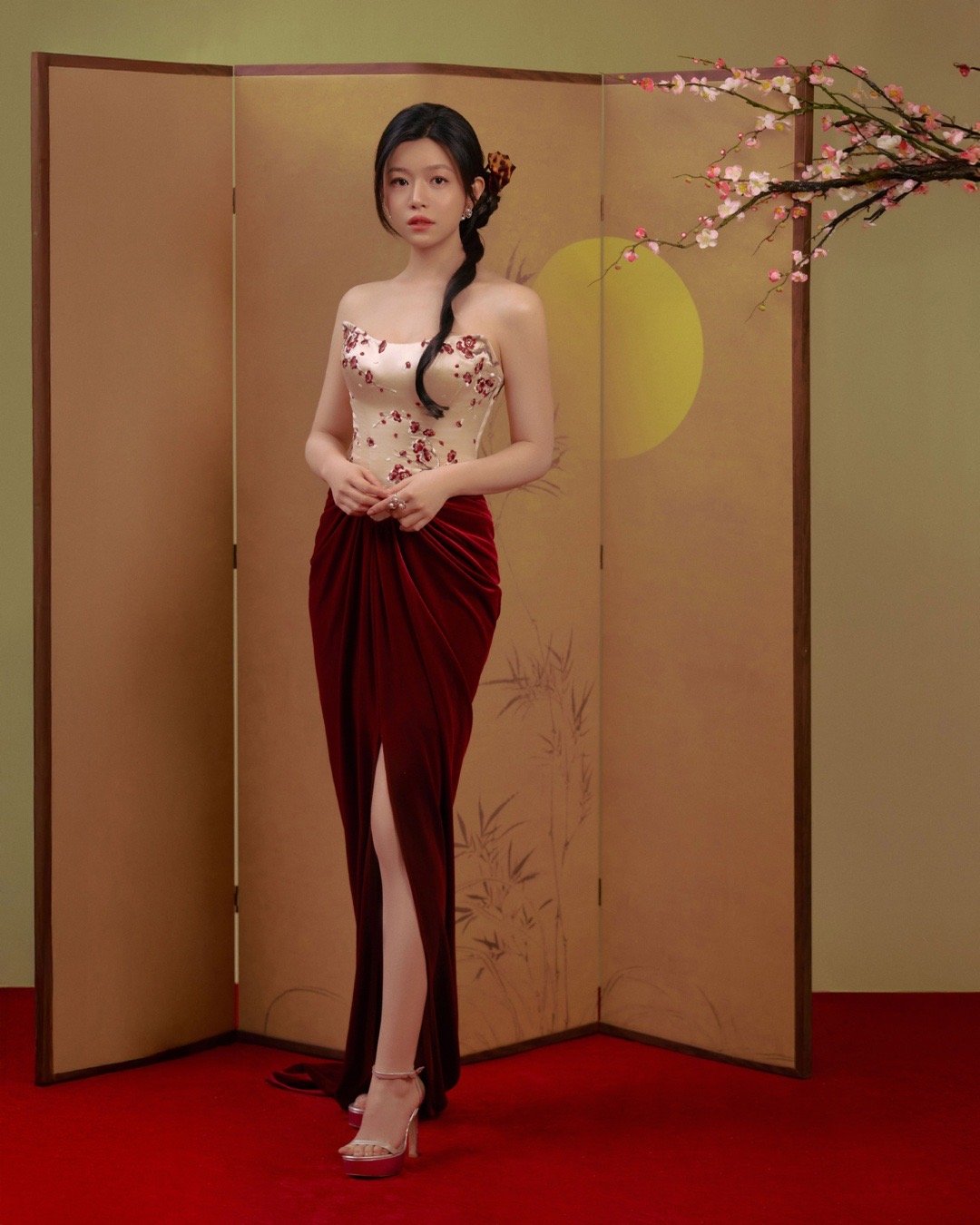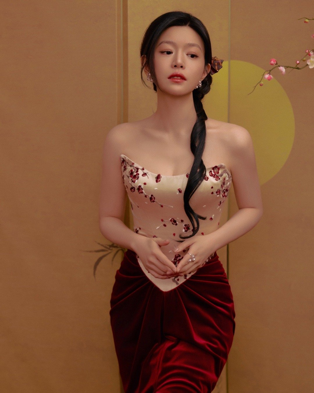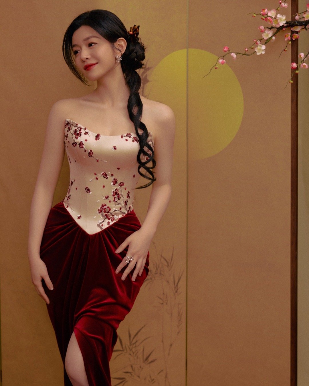 陈妍希冬日蜡梅 一袭红丝绒礼裙,在非遗晚宴上绽放东方诗韵!米白提花抹胸裁剪出精致线条,酒红裙摆如流霞垂坠,温婉气质与刺绣花枝相映,将东方雅致穿成了行走的艺术品。