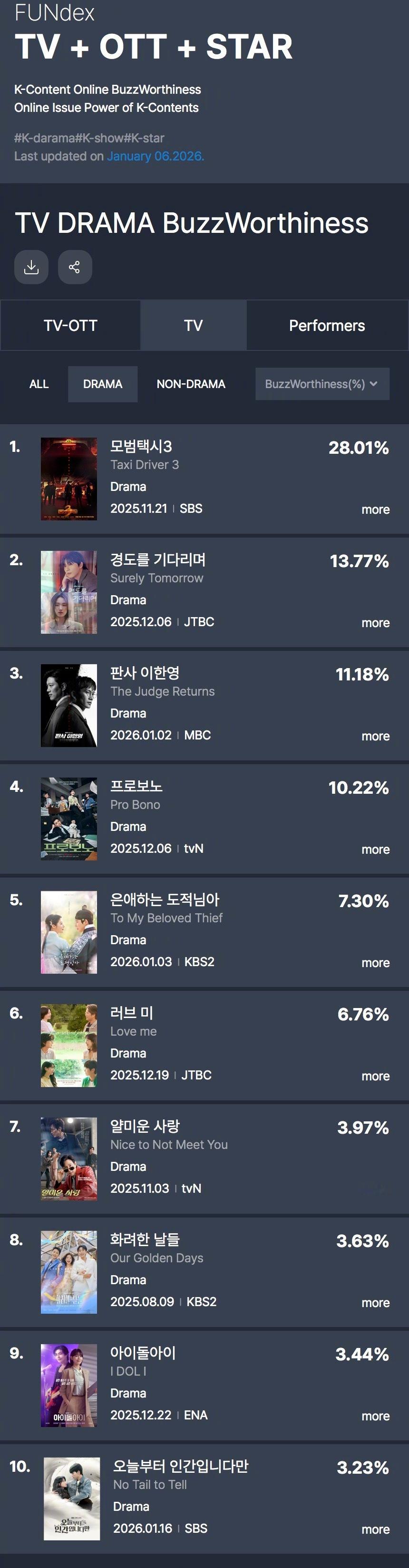 GOODDATA公布2026年1月第1周TV-OTT热度话题性排行。1.模范出租车3 21.09%2.韩国制造 11.56%3.等待京道 10.37%4.现金英雄 5.法官李汉英 6.韩剧公益律师 7.韩剧恩爱的盗贼大人 8.韩剧Love Me 9.不幸的幸会 10.华丽的日子 GOODDATA公布2026年1月第1周电视剧热度话题性排行。1.模范出租车3 28.01%2.等待京道13.77%3.法官李汉英 11.18%4.韩剧公益律师 5.韩剧恩爱的盗贼大人 6.韩剧Love Me 7.不幸的幸会 8.华丽的日子 9.偶像疯子 10.虽然从今天开始是人类