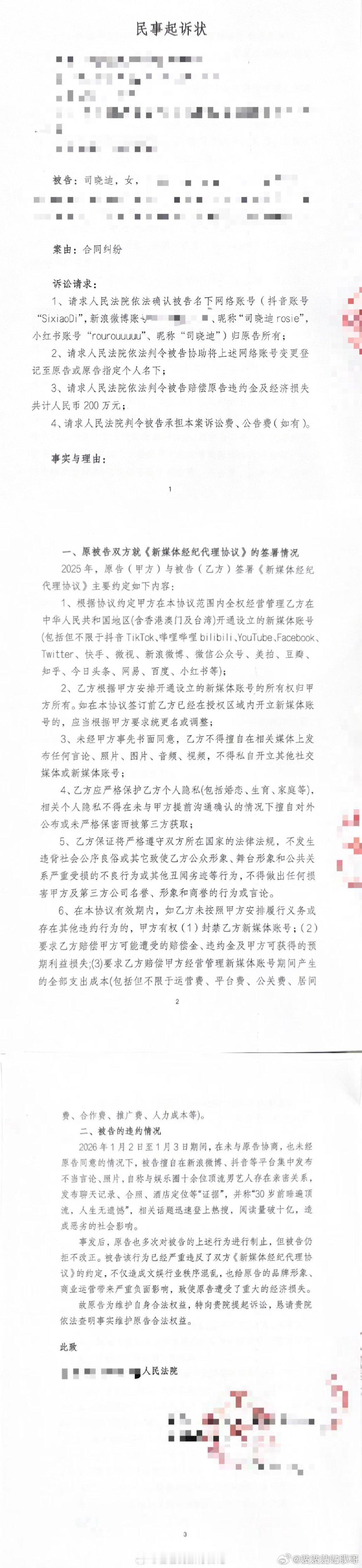司晓迪的经纪公司刚发文,向大众道歉。她在发微博的前一天,吃了40片药。目前公司决定起诉她,并向被牵连的艺人道歉。公司发了起诉书,要把司晓迪的账号全拿回来。