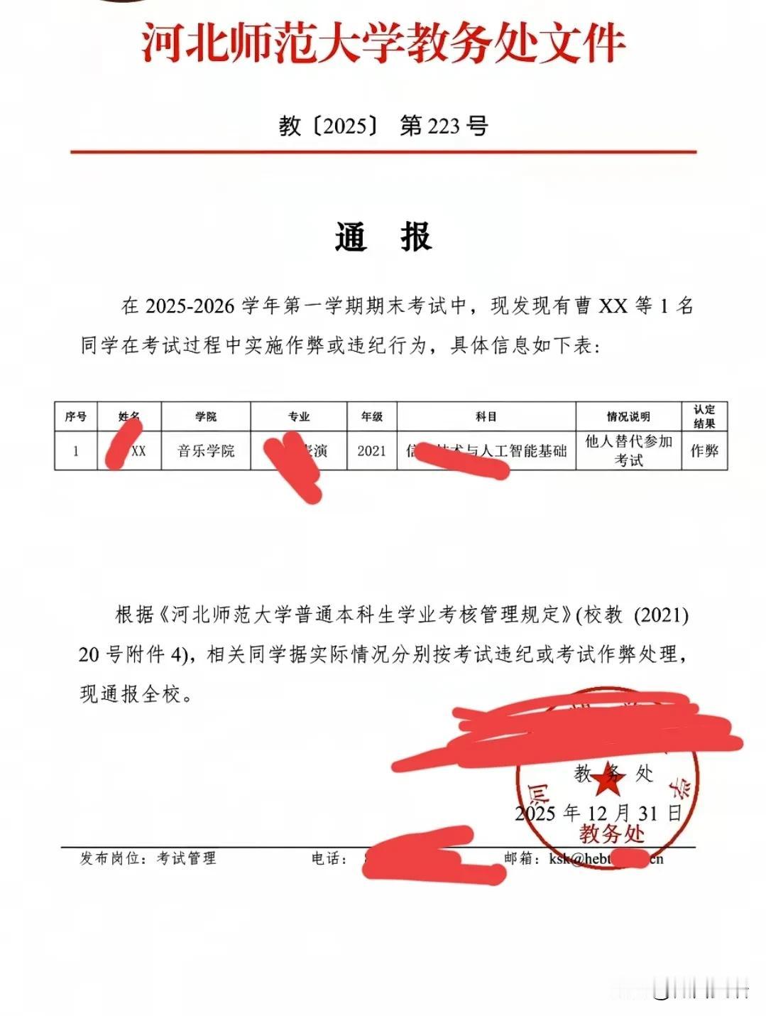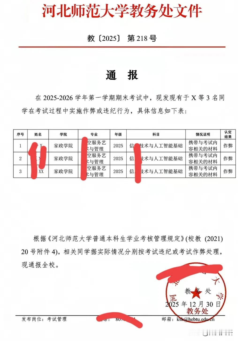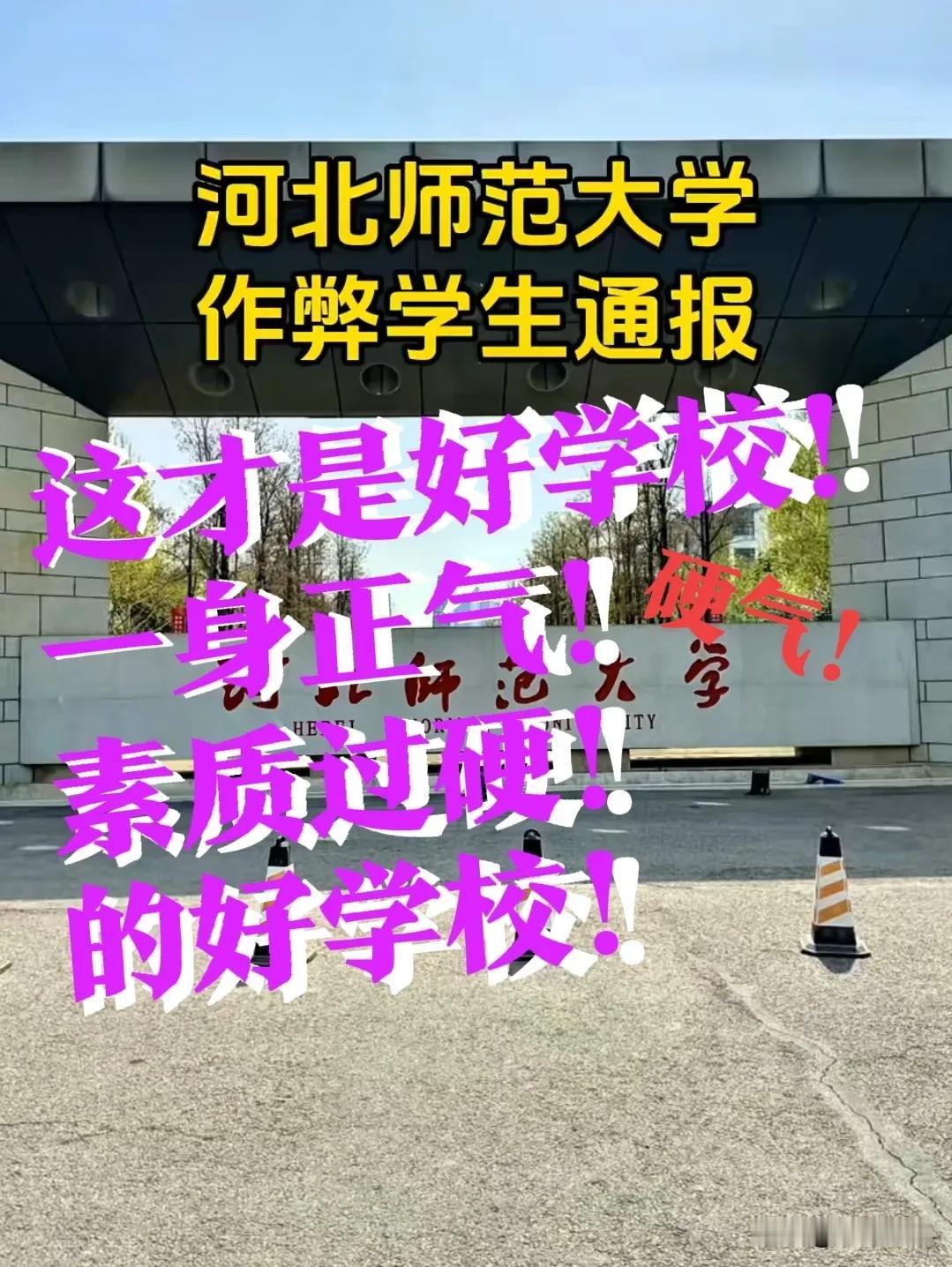 【硬气!!河北师范大学】这才是好学校!有正气,敢管理,一身正气!真抓实干,素质过硬的好学校!学校就应该为自己培养的学生负责! 河北师范大学发布了作弊学生通报!目的是为了学生能够把重心转移到学习上来!有的学生,因为上了大学就以为进了保险箱,不是游戏就是娱乐,不能因此就荒废了学业!这次通报有利的净化了学校的考试环境和氛围,有利于学校人才层次的不断提高! 带定位晒今日生活 信息图片来源网络侵权联删