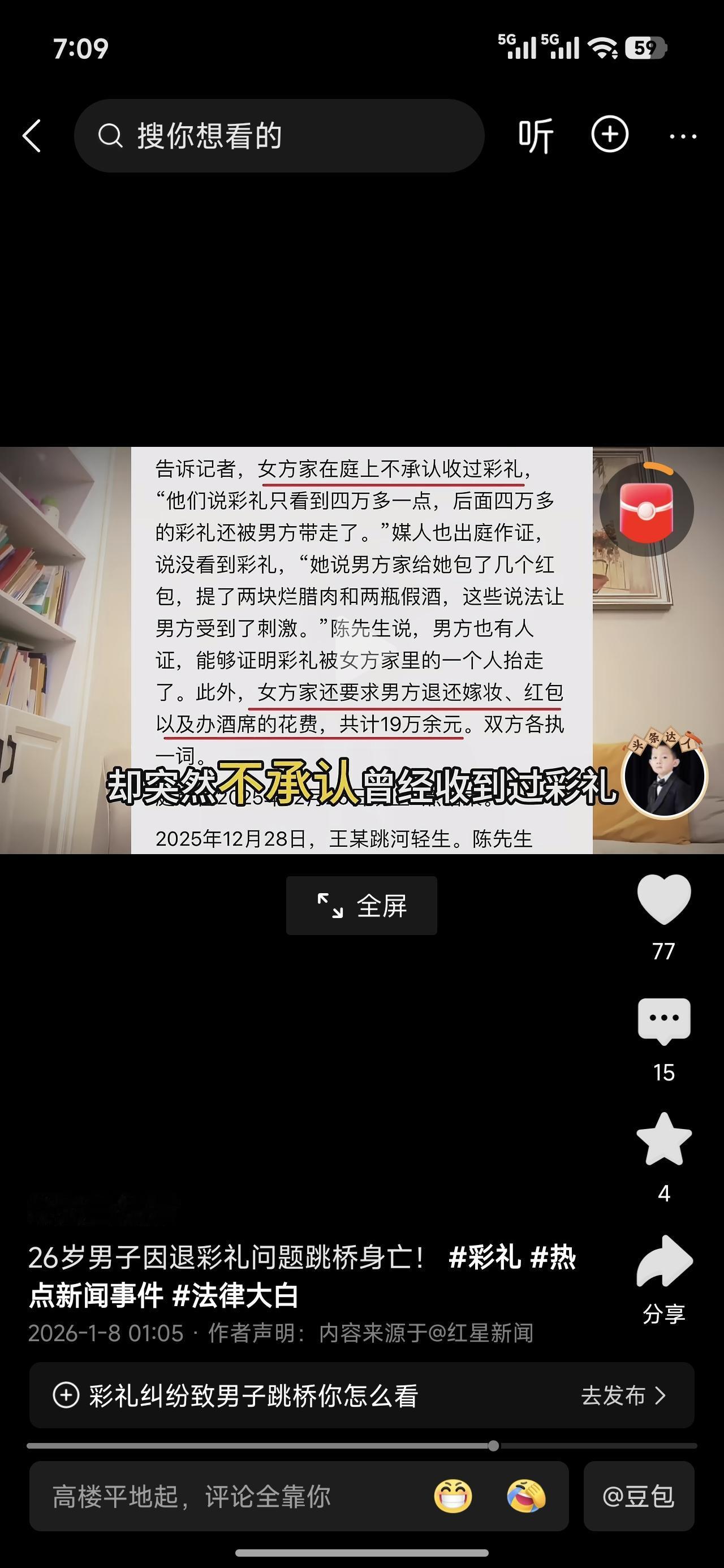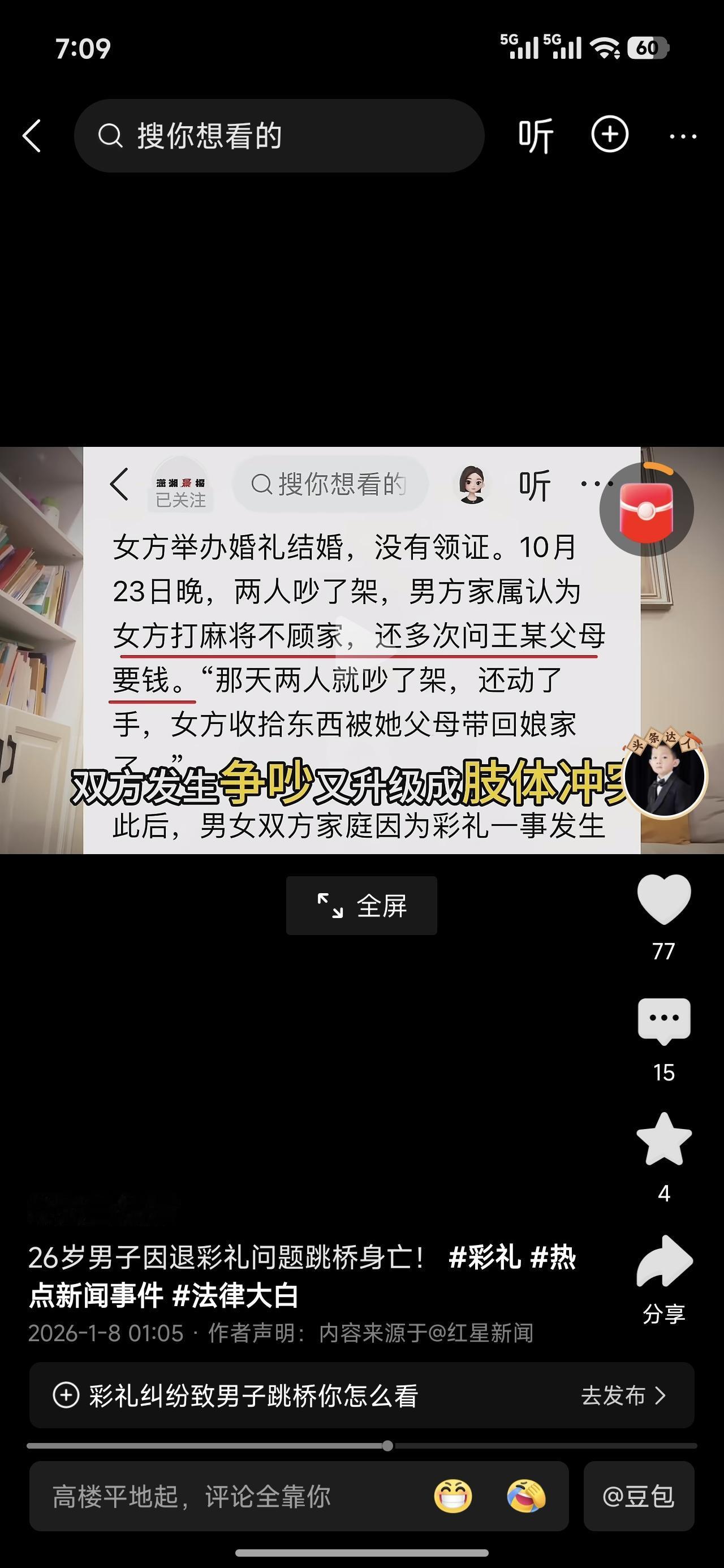 26岁男子跳桥身亡。12万的彩礼,十万是借的。五万是贷款,五万是借的亲戚朋友的。 结果不到三个月,双方闹僵了。结婚不领证,这是没打算长结啊!结个三五个月,整点彩礼钱。继续下一家? 双方对簿公堂,女方要求返还嫁妆红包以及办理酒席的钱,19万。好家活,是一分钱都不想自己出。合着这是生了个貔貅,只能进不能出啊! 出不了一点,貔貅没有屁眼! 男子承受不住了跳桥身亡。这时候官司才进行到第三天。这种情况下应该参考翟欣欣。 官司如果没有胜算的话,应该举着男子的黑白头像,去女方家门口等着,直到把彩礼全额返还为止。这种就不能惯着她毛病。效仿者很多。形成现象级了。