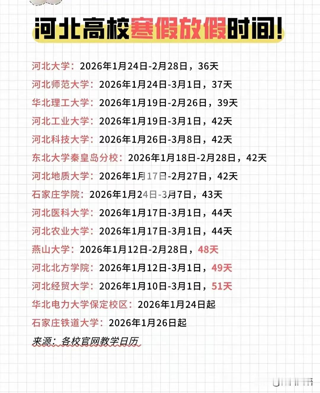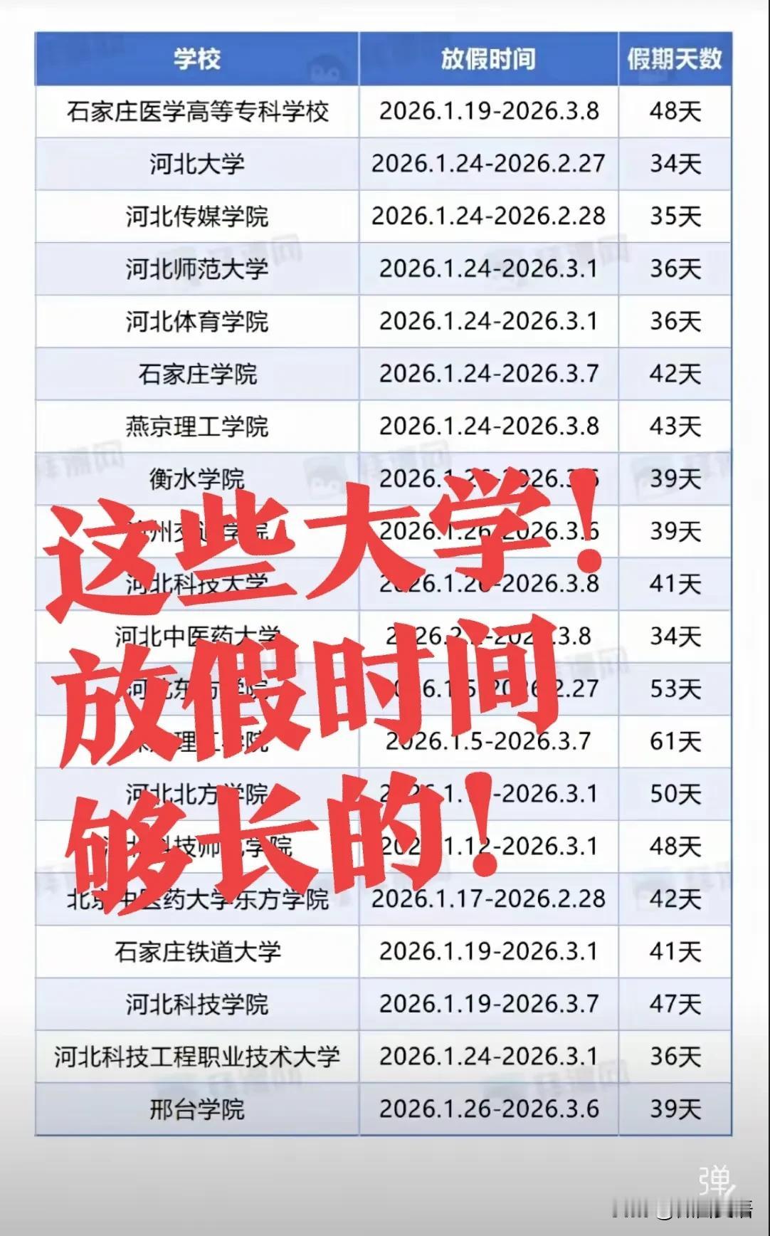 【放假时间够长的!河北高校,放假时间】这些高校,放假时间够长的!26年河北各高校寒假时间确定!这是具体的时间吗?都是网上的信息! 时间最长的是,宣化科技职业学院,2026.1.5-2026.3.3,一共57天!第二是邯郸学院,时间是从2026.1.10-2026.2.27,一共48天!第三名是,河北建筑工程学院,时间是从2026.1.10-2026.3.1,一共50天!以下其次是唐山学院,2026.1.10-2026.3.1 共50天!然后唐山师范学院,时间是从 2026.1.10-2026.3.1,共50天!还有 河北金融学院,2026.1.12-2026.2.27共 46天。河北民族师范学院,时间是2026.1.12-2026.2.28,共47天!还有 河北经贸大学,2026.1.12-2026.3.1共 48天! 有的放假时间够长的!这是放假时间,都是网上传播的,看看是实际的吗? 冬日生活打卡季 信息图片来源网络,如有不实,侵权联删!