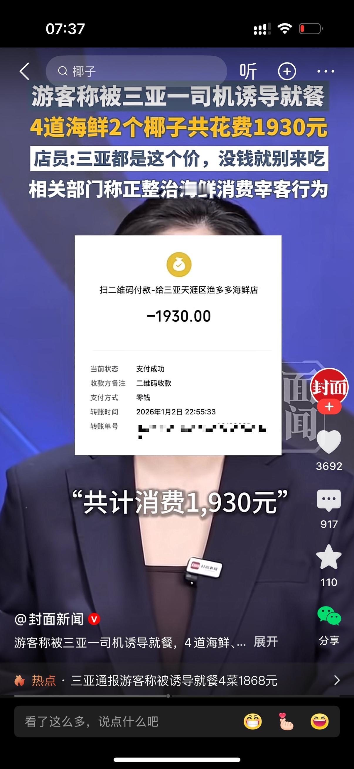 游客被三亚一司机诱导就餐,4道海鲜2个椰子消费1930元。游客直呼不可能,绝对不