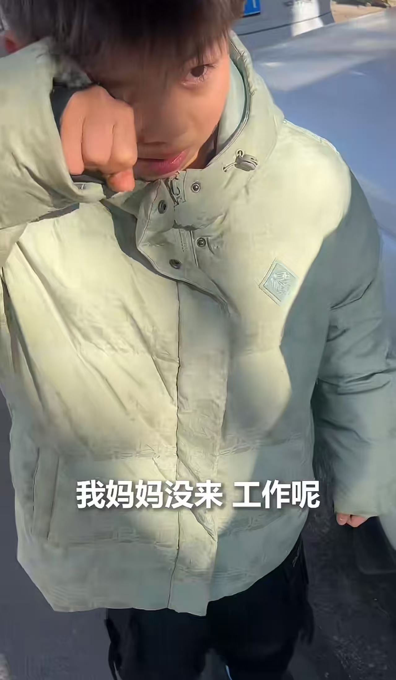 小男孩怕妈妈知道责罚,忍不住哭起来说:“我妈妈没来,她在工作呢。”