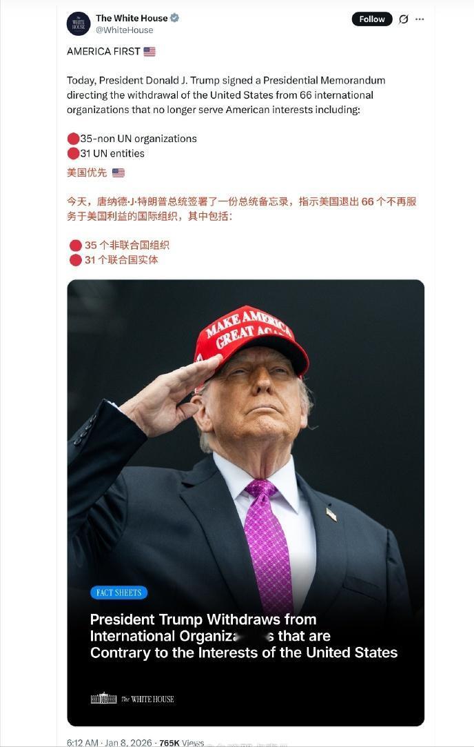 美国批量退群,一口气退了六十多个! 当地时间1月7日,特朗普直接签署备忘录,要退出66个“不符合美国利益”的国际组织,35个非联合国机构和31个联合国相关机构全被列入清单,说停资就停资、说退出就退出。 这是大国该有的样子?合着国际组织是为你美国量身定做的?符合利益就待着,不符合就拍屁股走人,简直是国际版“土匪流氓”操作!现在干脆批量退群,它咋不退出地球呢,还能给世界和平做贡献。 不过话说回来它退群早就不是新鲜事了,之前退世卫组织、退巴黎协定、退联合国教科文组织,反反复复跟闹着玩似的。只要规则不合心意、利益没占够,就立马撂挑子,理你什么全球合作大局、什么大国责任感。