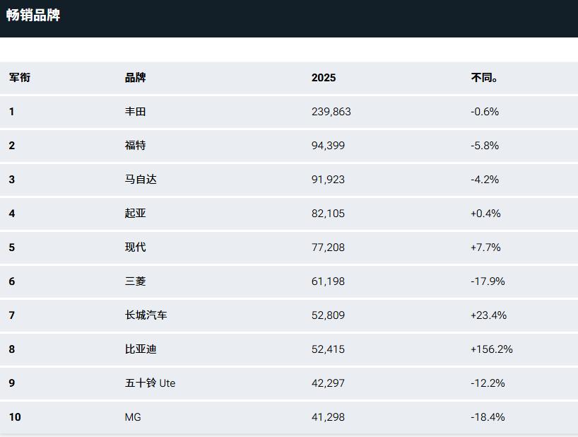 2025年澳大利亚销量最好的汽车品牌榜单出炉,有三个中国汽车品牌上榜,分别是比亚迪,长城和名爵。 丰田仍然是澳大利亚销量最好的汽车品牌,去年共售出239,863辆新车;福特排名第二,售出了94,399辆新车;马自达排名第三,销量为91,923辆。 长城汽车销量52,809辆,排名第7,同比增长23.4%。 比亚迪销量52,415辆,排名第8,没有哪个品牌增长比比亚迪更快,增长了156.2%,排名仅次于同为中国品牌的长城汽车。按照这个增长速度,比亚迪将在2026年成为澳大利亚销量最好的中国汽车品牌。未来有望超过三菱和现代汽车。 上汽名爵MG的表现则不那么乐观,销量下降了18.4%,销量为41,298辆。