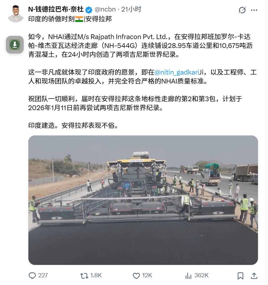 印度人的骄傲和自豪,总是这么的接地气和朴实无华。 近日,印度安得拉邦首席部长在国外社交平台上自豪的宣布,印度在基础建设方面又创造了两项世界记录。 根据这位印度官员的说法,印度一建设公司为修建一条重要的经济走廊,连续24小时不间断施工,在24小时内使用了约10675吨沥青混凝土,连续铺设了28.95公里的道路,并且道路的修建质量得到印度国家公路管理局(NHAI)的认证。该官员认为,这一非凡的成就体现了印度政府的愿景,是整个施工团队工程师、工人和现场人员的卓越投入。 另外,这位部长还介绍说,将于2026年1月11日在该经济走廊施工的第2、第3标段继续努力,再次尝试创造两项新的世界记录。 印度人的自信和民族自豪感是非常强烈的,印度人着迷于创造各项令人惊讶、惊叹、甚至惊吓的世界记录,用来证明印度人可以,印度人聪明。对此大家有什么看法?欢迎留言讨论。