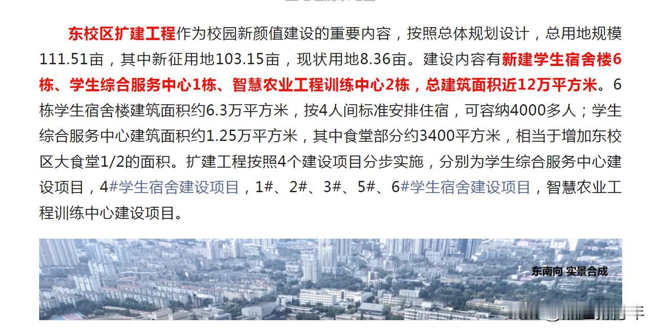 大动作!保定河北农大东校扩建总规模达111.51亩,保定支持103亩土地,扩建包括可容纳4000多人的学生宿舍、学生综合服务中心、智慧农业工程训练中心!效果图大概是这样的!
