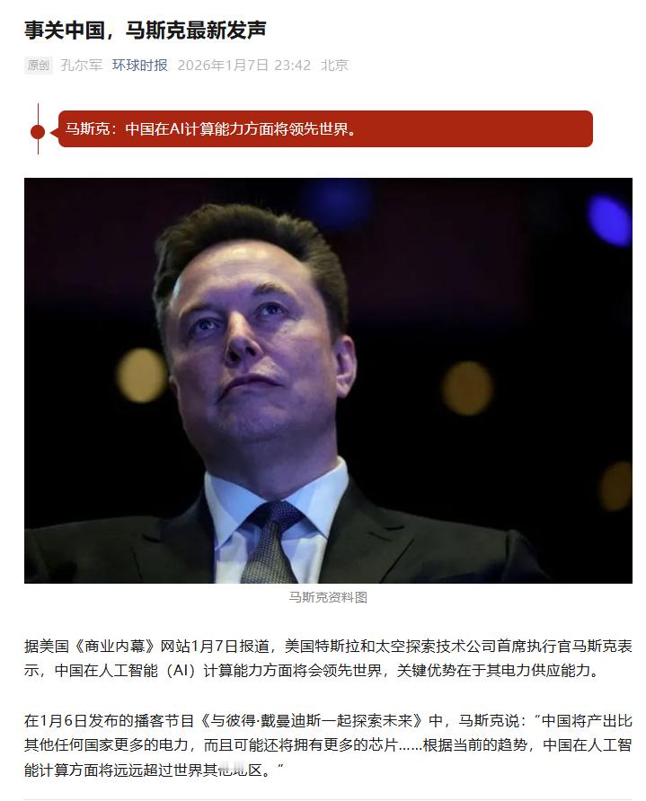马斯克说中国AI算力将领先世界 马斯克说根据当前趋势,中国在AI计算方面将“远远超过世界其他地区”。关键优势在于电力供应。AI竞赛的决定性因素不仅在于算法或芯片性能,更在于扩大电力生产和供应的能力。到2026年,中国的发电量可能达到美国的3倍,有能力支持耗能巨大的AI数据中心。电力供应是扩大AI系统规模的关键制约因素,而这一点常被低估。
