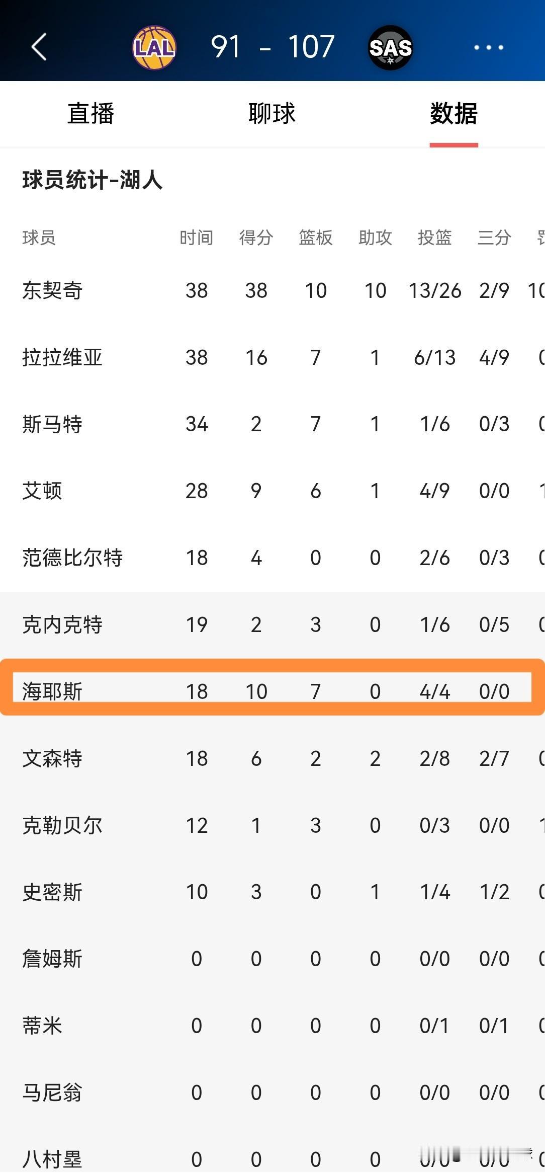 我真为湖人替补中锋海斯鸣不平!虽然今天湖人在客场以91:107惨败于马刺,但是海斯的表现却非常不错,可惜的是由于海斯的球队低位不高,仅仅得到了18分钟的上场时间。 全场比赛下来,海斯替补出战18分钟,投篮4中4,其中罚球2中2非常高效的得到10分7篮板,没有出现任何的失误。 老实说,我真为海斯鸣不平,假如海斯在其他球队效力的话,以海斯的能力来看,他的场均上场时间绝对可以超过20分钟。
