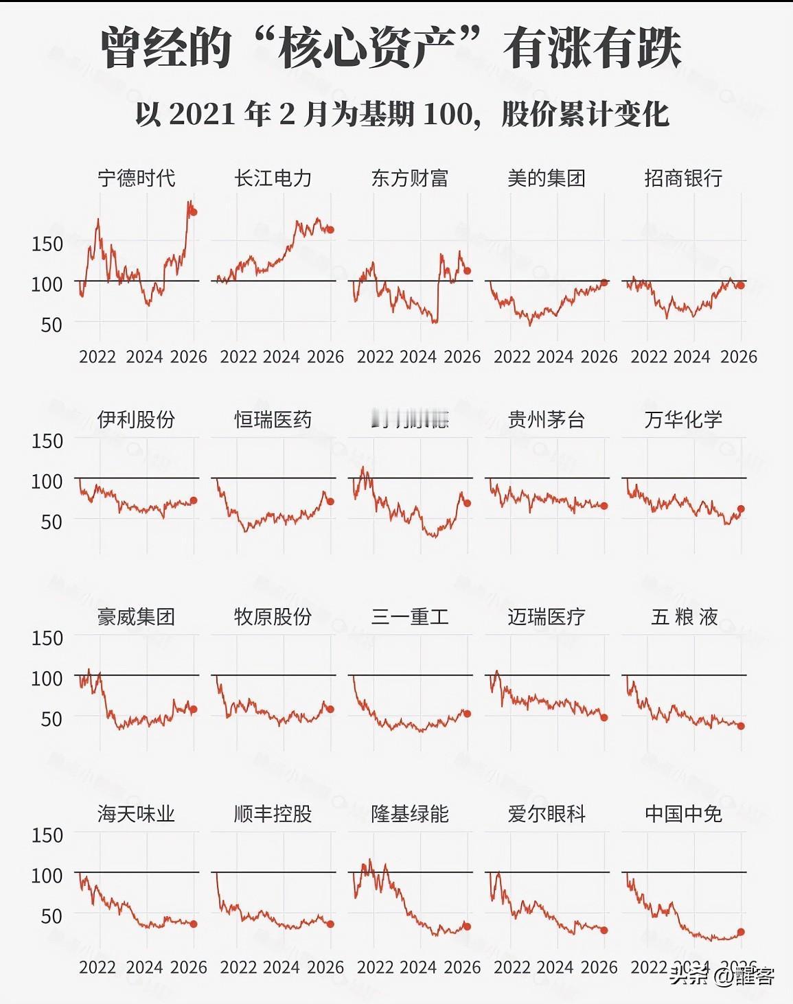 什么样的资产才能称之为A股的核心资产? 拉长时间来看,对于A股这种忽涨急跌的市场,真找不出几个标的可以称之为核心资产。比如2025年是A股的科技大票之年,科技大票的PE纷纷来到数百倍,而对标的美股科技公司PE仅为20-30倍左右。 疯狂过后一般都是一地鸡毛,这是 A股的惯性,三十多年均是如此,甚至在阿里巴巴、腾讯等公司身上都应验,更不用说几年前爆红的一些互联网企业股票。大多数情况如今的市值仅为当时的20-30%,在高峰点买入点这些资产的,目前早已血本无归。