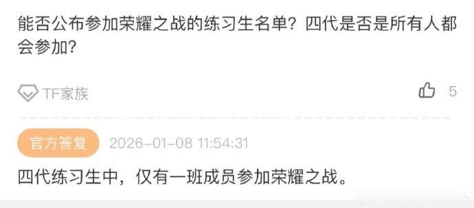 TF四代仅有一班成员参加荣耀之战TF四代不是所有成员都参加荣耀之战 14 人名单公布,陈奕恒、张桂源等一班成员出战,全员集结落空让不少粉丝直呼意难平~ tf四代荣耀之战名单