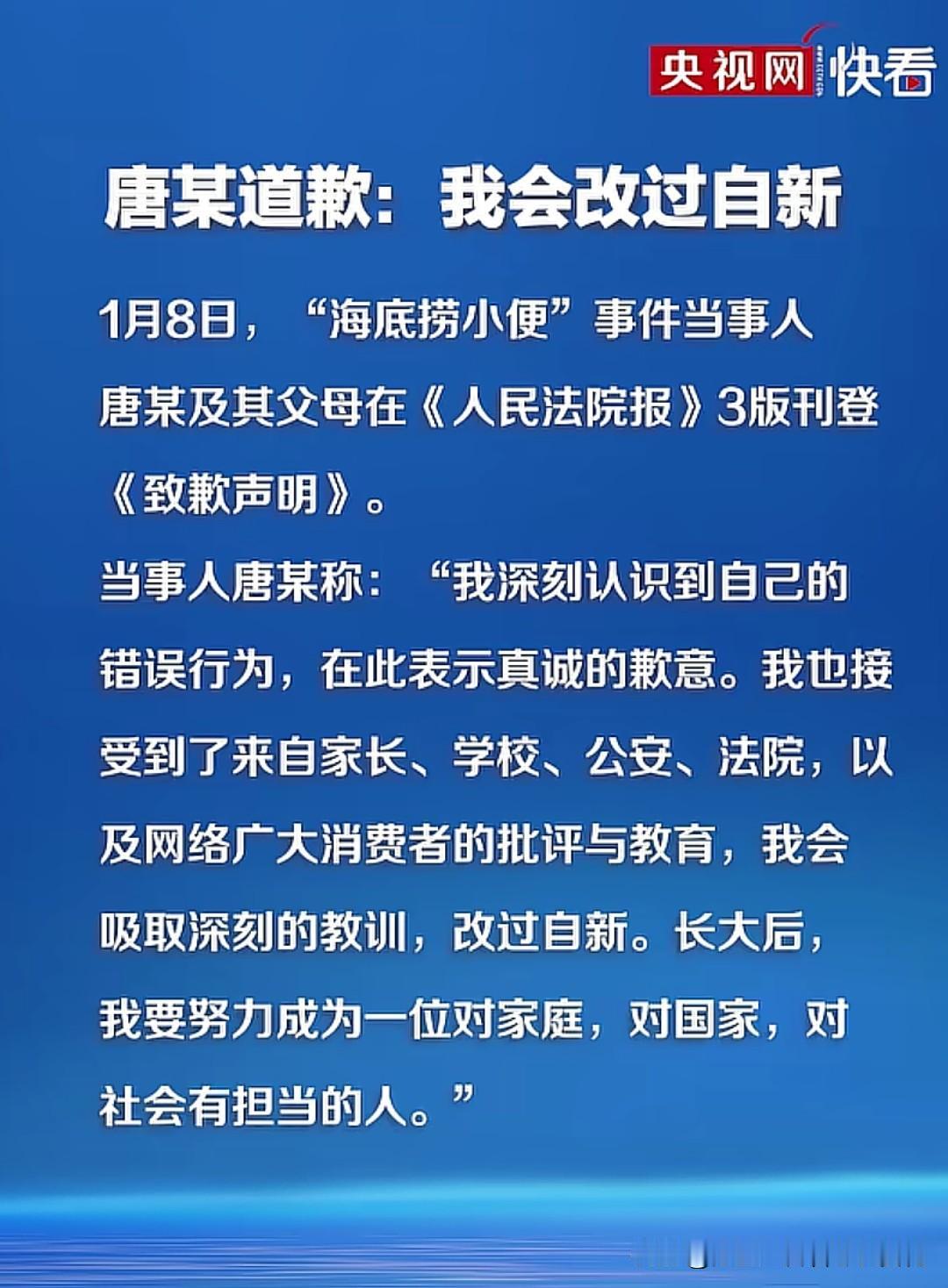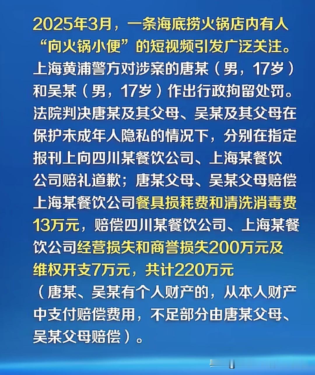 唐某和吴某道歉了,就是那个往海底捞火锅小便的两名17岁男生,一开始得意忘形,如今狼狈不堪,父母颜面扫地,双方父母共赔220万! 两人酒后做出这种出格行为,一看就是酒品不行,骨子里就是坏的,如果父母不严加管教,学校不闻不问,这些人会变得更调皮,更坏!如今大家也看到了,社会教育了这两个孩子,双方家庭也付出惨痛代价,孩子也变得老实了,果然人教人教不会,事教人一教就会。 要我说,一般的小孩,就是让他站桌上尿,都未必能做出来,说到底还是家庭教育的问题。大家觉得呢?欢迎留言。