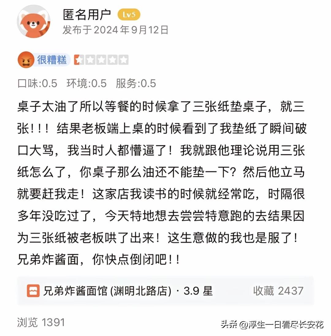 最近,江西南昌一家兄弟炸酱面被骂上了热搜。有顾客反映,自己在里面就餐多用了纸就被老板破口大骂,而且这家店的很多差评都指向了老板的素质很差看顾客不顺眼就会辱骂几句,这样的餐馆为何能开到至今? 笔者还了解到,这家餐馆在当地的口碑并不差,主要是价格亲民,味道也符合当地人的口味,因此这家餐馆的生意不差。唯一不好的就是老板喜欢赶人,在老板眼里,那些娇生惯养的顾客难伺候,要求太多,嫌这嫌那的,这是他不能容忍的。 之前就有饺子馆因顾客加醋就被老板挨打了,代价是这家饺子馆无法正常经营下去。如今同样的糟心事又再次发生,看来没有服务意识和职业操守是很难从事服务行业的。