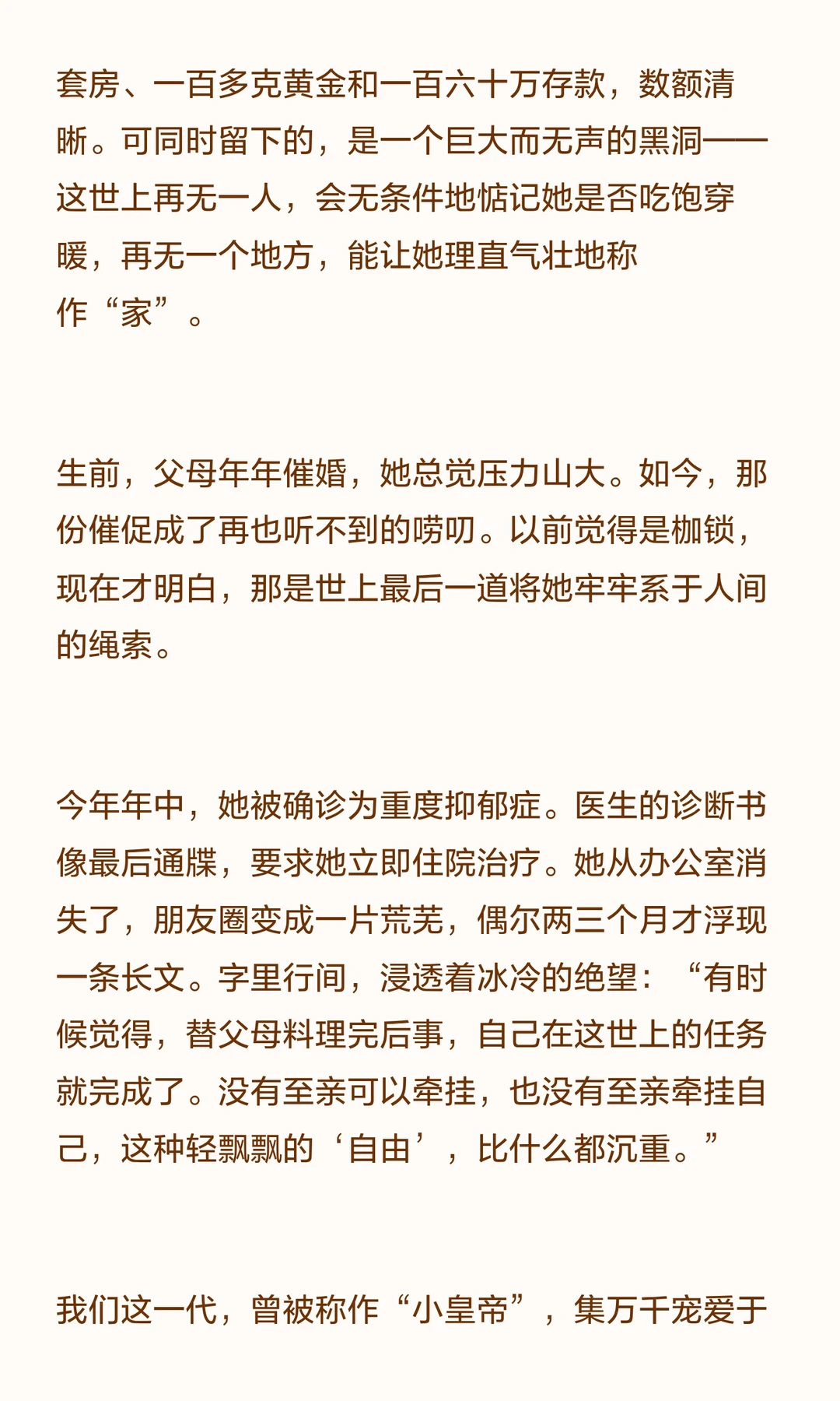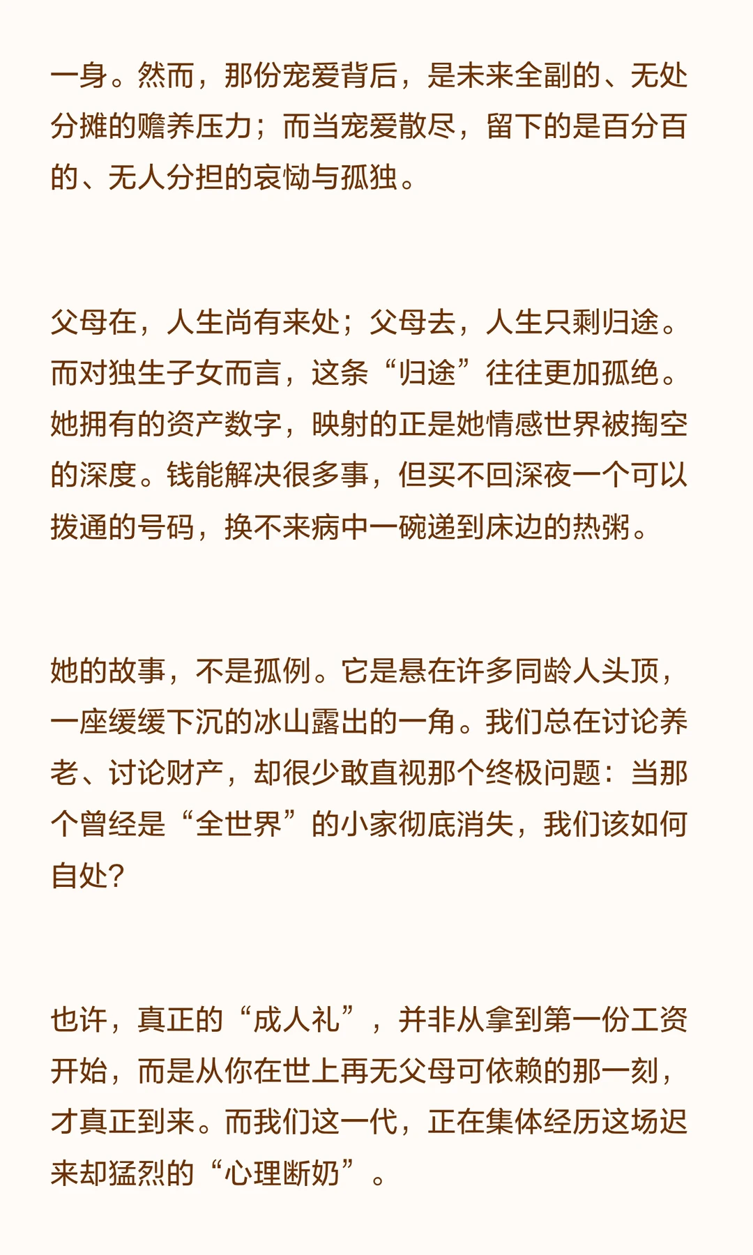 一位32岁的同事失去父母后陷入孤独与抑郁,资产虽多却无法填补情感空缺。 她从“小皇帝”变为独自面对未来,揭示了独生子女在父母离世后情感上的巨大冲击,提醒我们直面“心理断奶”的挑战。 独生子女如何面对这些?
