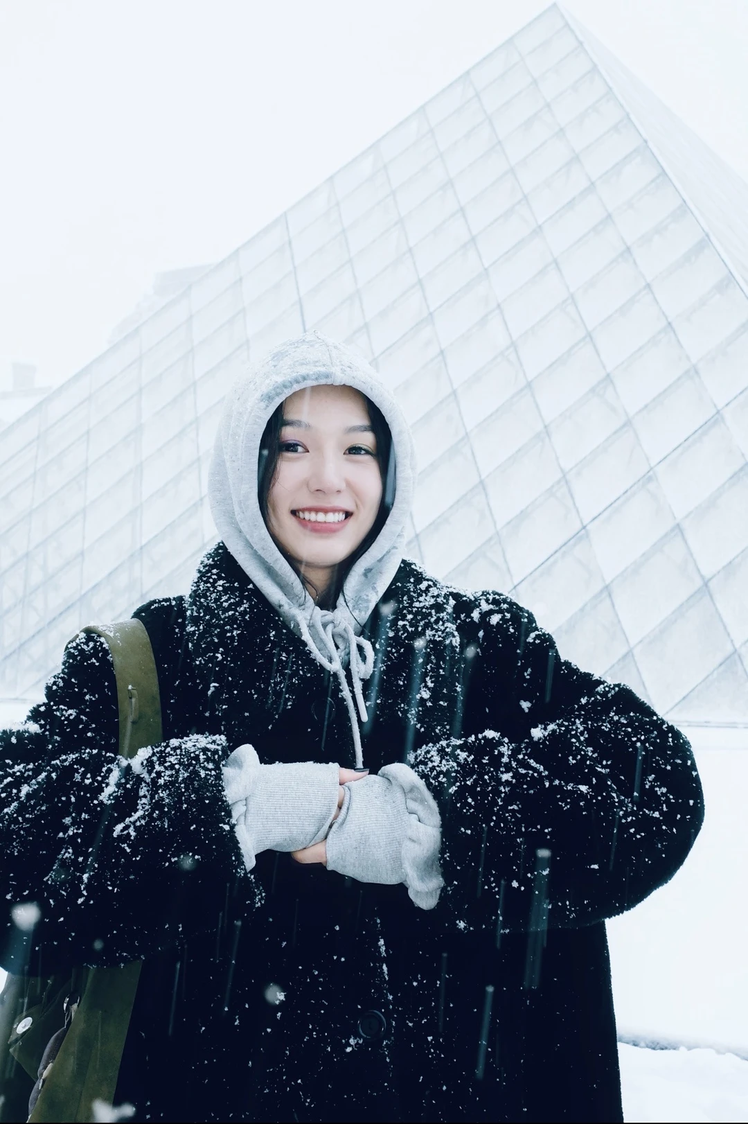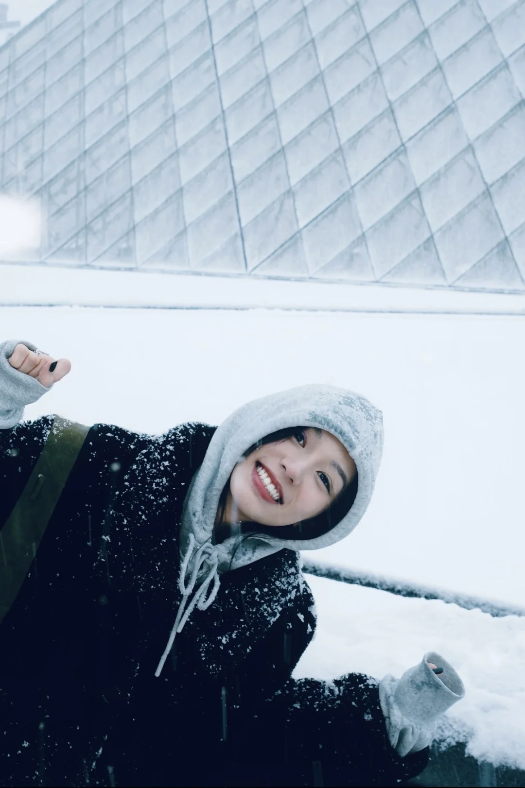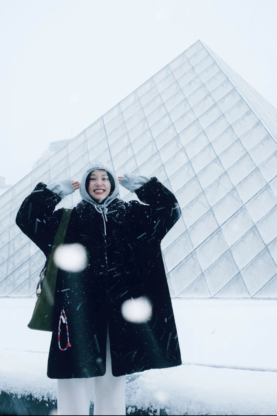周也在巴黎的雪天随拍,用黑大衣+连帽卫衣基础款组合,穿出了独一份的鲜活感,这搭配技巧值得学👇 ✨穿搭拆解 1. 材质对比:黑色大衣的厚重和卫衣的软糯质感形成对比,让基础款搭配更有肌理感,避免单调。 2. 色彩极简法则:全身只用到黑、灰、白三种颜色,极简配色在雪景中更显高级,也符合巴黎的文艺氛围,怎么拍都不出错。