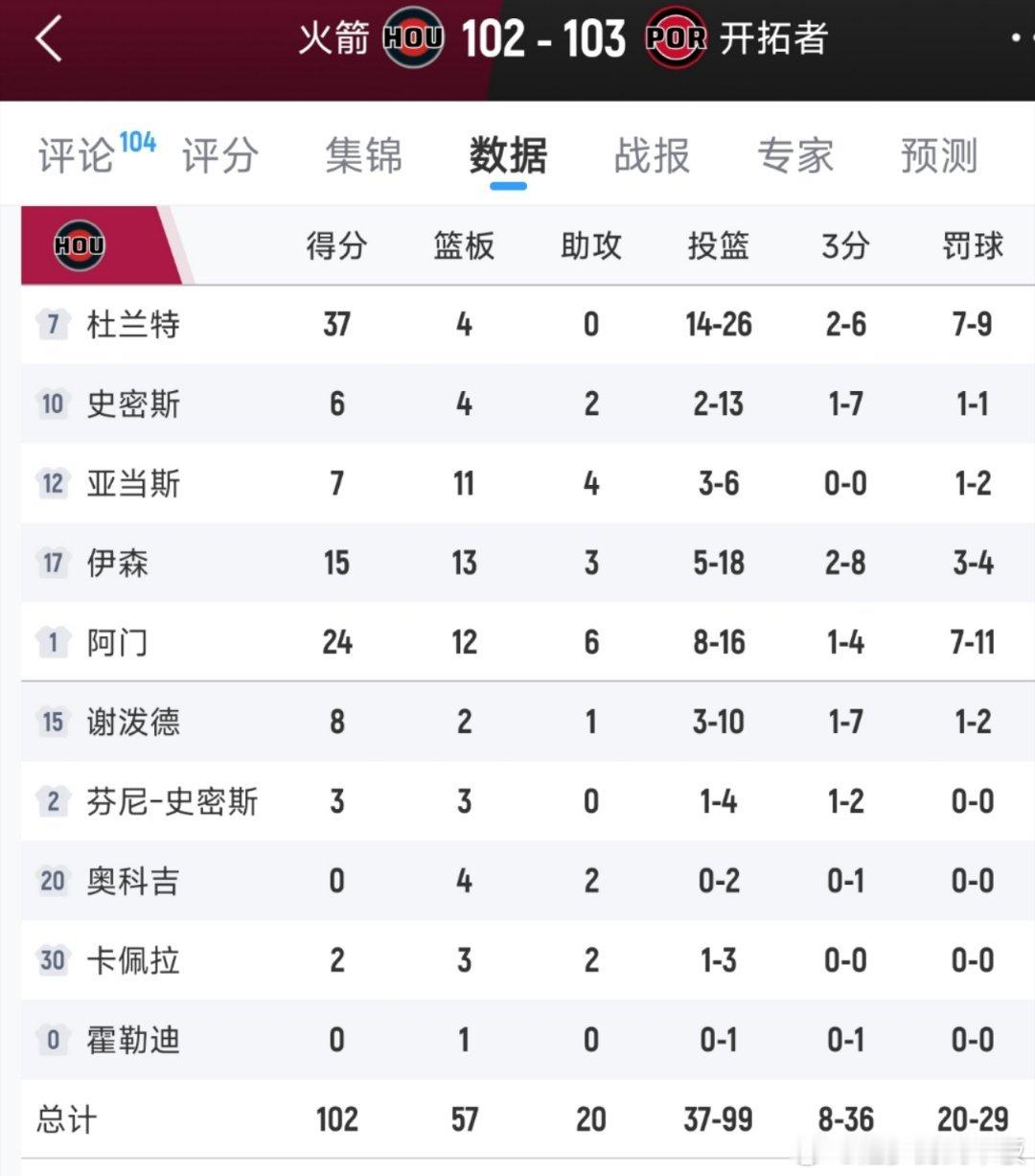 伊森补篮超时!火箭客场102-103不敌开拓者,湖人继续以0.5胜场优势,排名西部第4。杜兰特37分,阿夫迪亚41分,杨瀚森登场16分31秒,3分3板2助5犯火箭vs开拓者