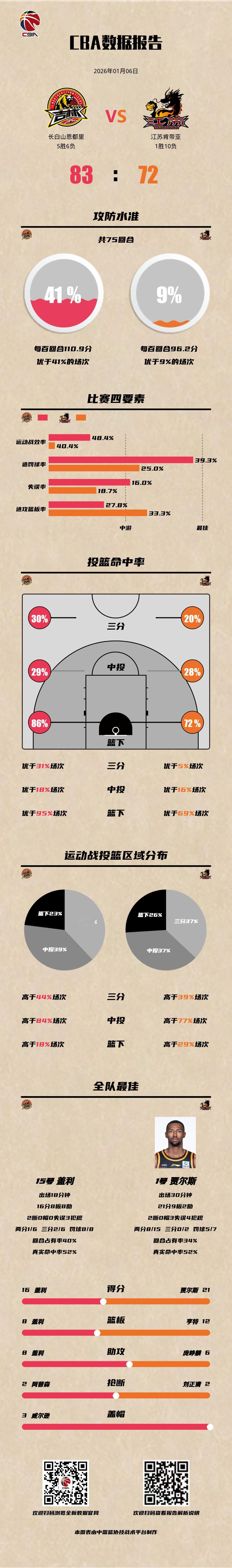 长白山恩都里 83-72 江苏肯帝亚吉林男篮vs江苏男篮 长白山恩都里:盖利16分8篮板8助攻2抢断,栾利程13分3助攻,摩尔13分; 江苏肯帝亚:贾尔斯21分9篮板2抢断,亨特15分12篮板,庞峥麟10分6助攻。CBA数据库
