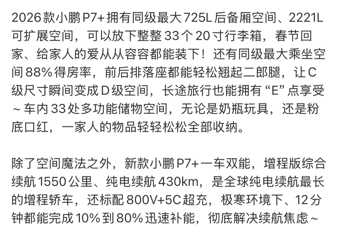 国内市场的确忒卷了,小鹏P7+不仅一如既往地空间名列前茅,而且配置更高、舒适性更好,最重要的是不再只有纯电,还追加了增程式插混车!而且还是大电池+大油箱的“我全都要”插混,这种续航焦虑被200%解决的感觉挺好……新款小鹏P7+自带空间魔法