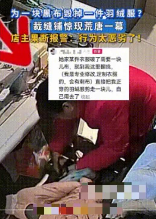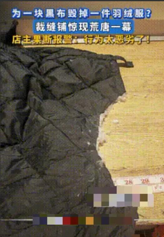 为块补丁剪坏新衣,大妈这操作太离谱! 一位阿姨某件衣服破了,到改衣店想找些碎布头,结果扒拉了半天没找到合适的边角料,于是盯上了一件挂在架上的新羽绒服,在左右张望确认没人后,掏出剪刀“咔嚓”一声,直接剪下一大截布料揣进包里,转身就走。 她还不如把羽绒服拿走呢,典型的损人不利己!损坏别人一件好的衣服,缝补自己的一件破衣服,自私分段位的话,这应该是顶级的,剪完剩下的衣服全部让她拿走,原价赔偿件新的,触犯的法律条例,派出所该罚罚该教育就教育。 一个人可以自私缺德到这种地步,无话可说了,再次觉得比起拘留罚款这些处罚,有些坏种还是更适合鞭刑,更长记性。 那句话咋说的?坏人绞尽脑汁,不如蠢人灵机一动,是这样的吧?这类事情总是让我好奇,这一类人脑子里是怎么想的。