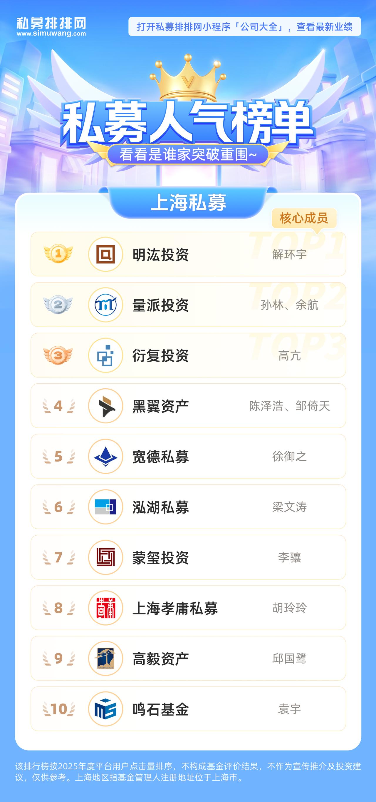 上海私募基金公司排名TOP10(2025年度) 点击查看私募最新业绩: 1、量派投资 全称为上海量派投资管理有限公司,是聚焦短周期赛道的量化私募基金公司。两位创始人均具备海外知名短周期交易公司从业经历,投研团队核心成员来自清华、北大、牛津等海内外顶尖院校,拥有深厚数理背景。公司系统均为自研开发,搭建了低延迟交易体系,核心策略包括指数增强、量化中性、CTA等。 2、衍复投资 是一家以量化方法从事投资管理的科技型私募基金公司,。创始人高亢拥有MIT双学位,核心团队涵盖海外头部对冲基金资深人士及清北交复等院校的技术精英,工程团队多具备一线互联网公司工作经历。公司聚焦中低频多因子策略,融合机器学习技术,因子库覆盖基本面、量价、另类数据等多维度,产品线覆盖300、500、1000等指数增强产品。 3、黑翼资产 全称为上海黑翼资产管理有限公司,是由业内资深对冲基金经理设立的百亿量化私募基金公司,总部位于上海。公司以股票量化、管理期货(CTA)基金为主营业务,构建了全流程AI量化体系,形成多元策略矩阵。连续多年蝉联金牛奖,累计斩获近100项行业奖项,核心团队具备深厚的量化投研与交易经验。 4、泓湖私募 全称为上海泓湖私募基金管理有限公司,是国内专注于宏观策略的私募基金公司,已通过中国基金业协会备案。公司以系统性宏观策略为核心,依托宏观经济周期、货币供应量、政策导向等多维度研究,结合量化择时模型,确定大类资产配置比例,同时通过量化模型精选品种优化收益。 5、蒙玺投资 全称为上海蒙玺投资管理有限公司,2016年1月成立,是聚焦低延迟量化领域的百亿私募基金公司。创始人李骧为量化行业老将,核心团队近80人,自研纳秒级交易系统保障执行效率。公司策略以另类数据驱动为核心,因子构成中另类因子占比60%,辅以基本面和量价因子,换手率维持在100-150倍,中性与指数增强策略表现突出。