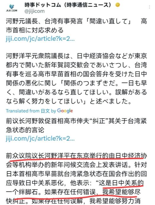 事态严重了!日本政坛大佬,资深政治家河野洋平公开出来对高市早苗施压了!当地时间1月7日,根据日媒报道,年届快90岁的前日本众议院议长河野洋平在新年问候交流会是表示,日本首相高市早苗在国会就台湾紧急状态发表的言论导致日中关系恶化,这是日中关系的一个绊脚石。 作为前众议院议长、自民党内资深大佬,河野在日本政坛的分量和影响力毋庸置疑,尤其是他长期以“知华派”著称,深耕中日友好多年。 这样的身份站出来发声,远比普通政客的批评更有分量,也更能引发日本国内各界对高市早苗相关言论危害性的重视。 他直接点出高市早苗的言论是“日中关系的绊脚石”,这话看似直白,实则戳中了问题的核心: 中日关系的发展根基本就建立在1972年《日中联合公报》的共识之上,而高市早苗在台湾问题上的不当言论,恰恰触碰了这份公报的底线,动摇了两国关系的基石。 河野洋平特意强调1972年《日中联合公报》中日本“充分理解并尊重”中国关于台湾是领土不可分割一部分的立场,还提及两国为拓展关系付出的巨大努力,这背后藏着两层关键逻辑。 一方面,是明确划定红线,提醒高市早苗政府,中日关系能有今天的局面来之不易,是几代人努力的结果,不能因为个别政客的激进言论就付诸东流。 要知道,河野本人就是中日友好的践行者,早年不仅反对李登辉窜访日本,还在慰安妇问题上发表过正视历史的“河野谈话”,即便因此遭到日本右翼势力的反对也始终坚持立场,这样的经历让他对维护中日关系共识的重要性有着比旁人更深的体会。 另一方面,也是在向外界传递信号,日本国内并非所有势力都认同右翼的激进对华政策,仍有大量资深政客和有识之士坚守中日友好的基本盘,不希望看到两国关系因为台湾问题走向恶化。 从日本政坛的内部格局来看,河野洋平的公开施压,也反映出日本自民党内部乃至整个政坛在对华政策上的深层分歧。 高市早苗作为日本首相,其发表的涉台言论显然带有明显的右翼倾向,试图在台湾问题上搅动是非,这背后可能有迎合国内右翼势力、巩固自身政治地位的考量。 但这种做法无疑会让日本陷入外交被动,损害日本在经济、贸易等多个领域与中国的合作利益。 河野洋平此时站出来,正是抓住了这种政策的致命漏洞,用“纠正言论”“澄清误解”的呼吁,倒逼高市早苗政府回归理性。 毕竟,中日作为邻国,经济互补性极强,无论是贸易往来还是人文交流,都有着深厚的基础,一旦关系恶化,对日本的发展绝非好事。 河野的表态,某种程度上也是在为日本的国家利益止损,避免因首相的激进言论让日本付出不必要的代价。 更值得琢磨的是,河野选择在1月7日这个新年伊始的时间点发声,时机拿捏得相当有讲究。 新年通常是各国规划新一年外交政策的关键时期,此时提出纠正言论、澄清误解,既能及时遏制高市早苗言论的负面影响进一步扩散,也能为新一年的中日关系定调,呼吁双方回到共识轨道上来。 这种看似温和却态度坚决的施压方式,比单纯的指责更有力量,也更符合河野“鸽派”政治家的行事风格。 说到底,河野洋平的公开表态,既是对高市早苗破坏中日关系行为的直接反对,也是对中日友好共识的坚定捍卫,更折射出日本国内希望维护两国关系稳定的理性声音。 这对于当前紧张的日中关系来说,无疑是一股重要的缓冲力量,也让高市早苗政府不得不重新审视自身的涉台言论,掂量其中的利弊得失。