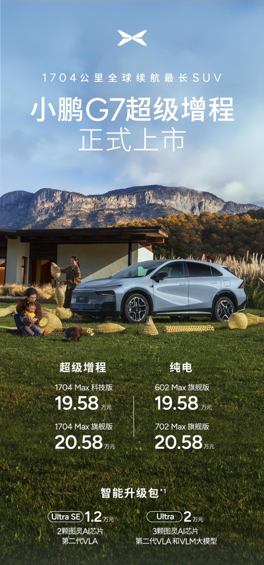2026款小鹏G7超级增程售价19.58万元起,小鹏G7纯电售价19.58万元起 2026款小鹏P7+全面焕新,售价18.68万元起 2026款小鹏G6售价17.68万元起!全系标配图灵AI芯片 2026款小鹏G9售价24.88万元起