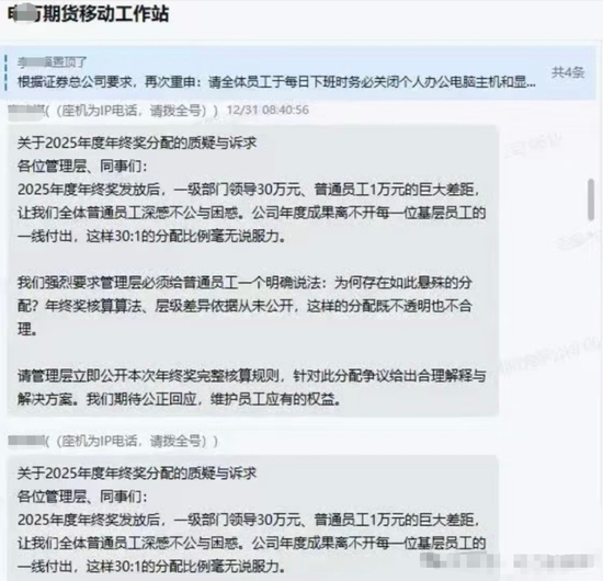 该员工表示:“关于2025年度年终奖分配的质疑与诉求。各位管理层、同事们:2025年度年终奖发放后,一级部门领导30万元、普通员工1万元的巨大差距让我们全体普通员工深感不公与困惑。公司年度成果离不开每一位基层员工的一线付出,这样30:1的分配比例无说服力。我们强烈要求管理层必须给普通员工一个明确说法:为何存在如此悬殊的分配?年终奖核算算法、层级差异依据从未公开,这样的分配既不透明也不合理。请管理层立即公开本次年终奖完整核算规则,针对此分配争议给出合理解释与解决方案。我们期待公正回应,维护员工应有的权益。”