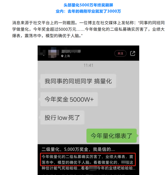 这还不是天花板。早几年就有量化私募年终奖发5000万的传闻,当时多家私募业内人士直言:对于头部量化机构的个别核心员工而言,5000万年终奖不足为奇。