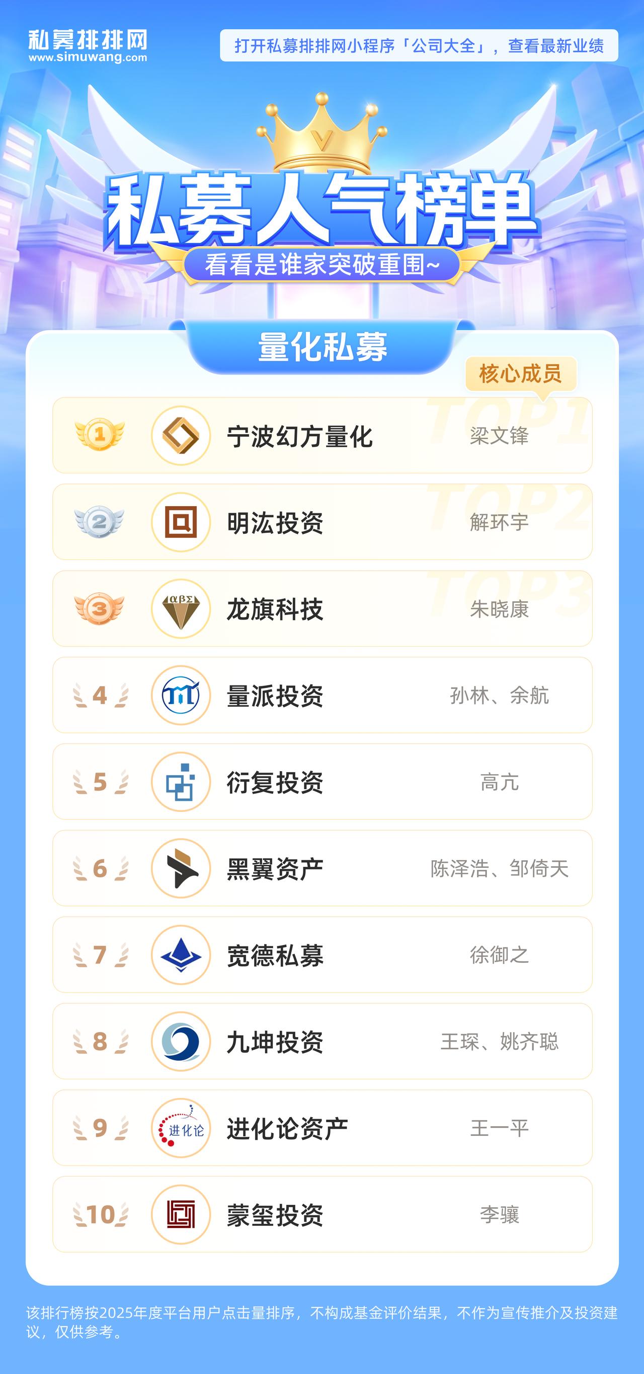 量化私募基金排名TOP10(2025年度) 点击查看私募最新业绩: 私募排排网数据显示,2025年量化私募基金公司热度排名前十的公司为宁波幻方量化、明汯投资、龙旗科技、量派投资、衍复投资、黑翼资产、宽德私募、九坤投资、进化论资产、蒙玺投资。 1、宁波幻方量化 量化私募基金公司之一,成立于2016年2月,实控人为梁文锋,总部位于杭州,2018年确立AI发展方向,自研萤火超算集群,算力投入超10亿,核心团队AI算法实力雄厚。管理规模峰值超千亿,后主动调整至约600亿,稳居行业头部阵营,曾获私募金牛奖,同时布局DeepSeek大模型,在量化与AI融合领域处于前沿地位。 2、龙旗科技 全称为杭州龙旗科技有限公司,成立于2011年10月,创始人朱晓康为波士顿大学经济学博士,2014年完成私募备案。作为老牌量化机构,专注股票量化领域,2024年新晋百亿私募梯队,当前管理规模约300-400亿。策略从传统统计科学逐步迭代至机器学习,量化择时特色鲜明,核心团队具备BlackRock背景,经历完整牛熊周期考验。 3、量派投资 是量化私募基金公司,全称为上海量派投资管理有限公司,成立于2019年12月,创始人孙林、余航均具备TwoSigma等海外量化机构背景。公司深耕短周期赛道,2024年10月新晋百亿私募,核心策略聚焦高夏普、低回撤、低相关性特性,构建了指数增强、量化中性、量化CTA、量化选股等多策略产品线。 4、衍复投资 成立于2019年7月,创始人高亢拥有MIT双学位,曾任职于TwoSigma,核心策略为中低频多因子结合机器学习,因子库涵盖40%基本面、30%量价、30%另类数据,全面覆盖300、500、1000指增及小市值赛道。当前管理规模约700-800亿,核心团队融合美国对冲基金与百度技术背景。 5、黑翼资产 成立于2014年,创始人陈泽浩、邹倚天均毕业于斯坦福大学,为华尔街归国量化精英。公司专注中频策略,连续6年斩获私募金牛奖,管理规模400-500亿,是百亿量化梯队中的稳健代表。构建了全流程AI量化体系,形成选股、指增、中性、多策略、CTA多元策略矩阵。
