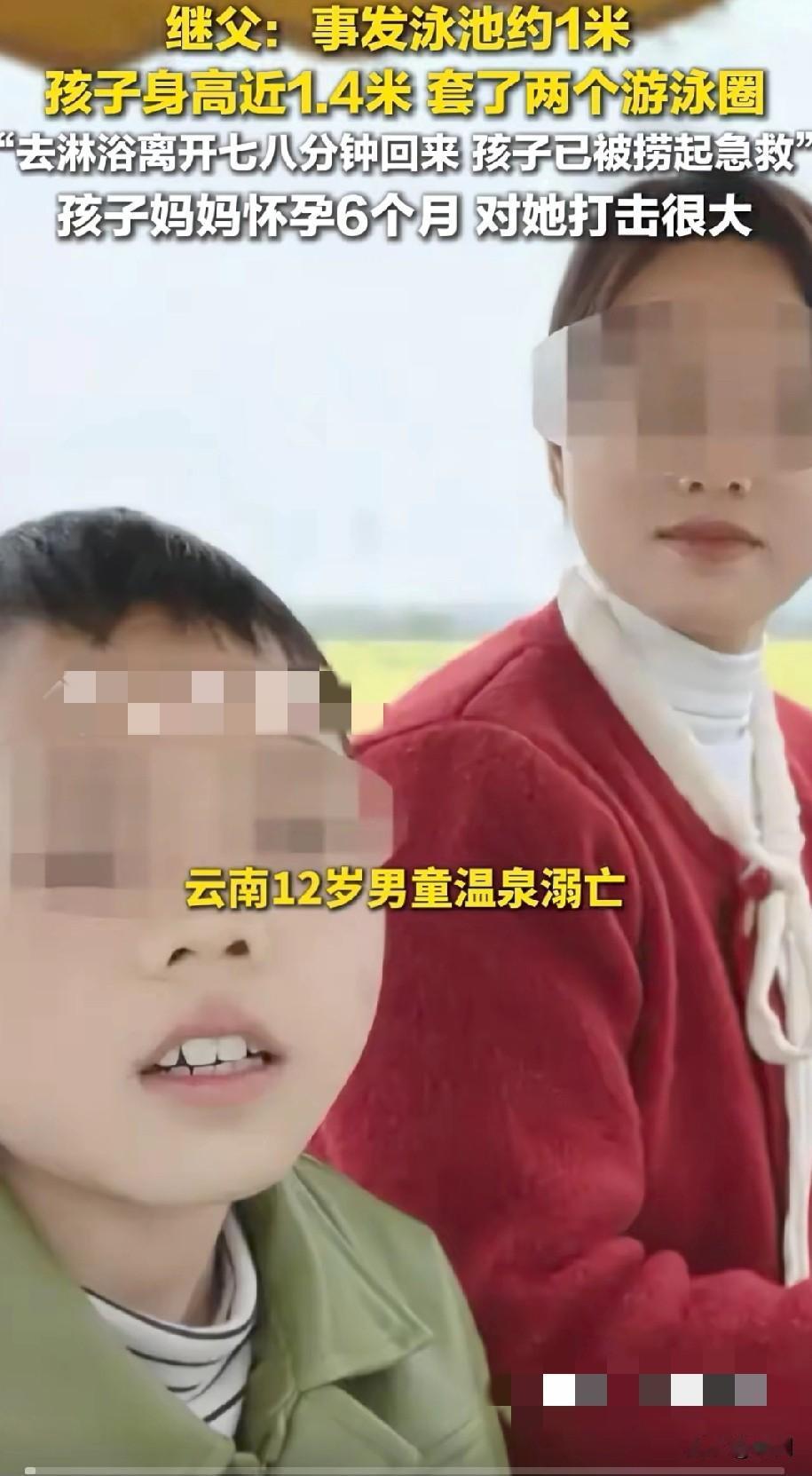 云南12岁男孩温泉溺亡! 继父:自己离开仅仅几分钟…… 孩子妈妈已经怀孕6个月,得知孩子淹死崩溃不已,打击很大,目前孩子遗体仍在医院…… 事发地点在云南紫光世纪温泉酒店,是当地最大的四星级酒店,继父表示“男童身高1.4米,事发时带了两个游泳圈,泳池的水不深,将近1米,自己去淋浴区冲洗,让孩子在泳池边休息,离开仅7、8分钟,回来看见孩子已被捞起急救,不清楚是怎么溺水的” 警方:派出所正配合调节! 我想说为什么给孩子带两个游泳圈呢,这要是头朝下翻过去肯定翻不过来啊,继父作为监护人是有责任的,孩子玩水真的要家长全程看护,不可离开,出现点意外后悔都来不及…孩子母亲已经怀孕,深受打击,希望尽快查明真相吧,让更多人看到,悲剧不再发生……