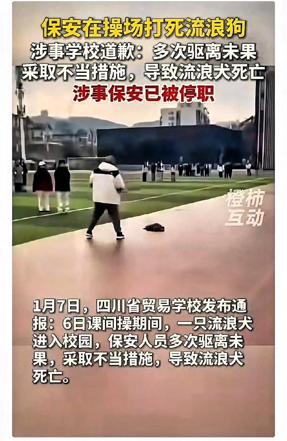 舆情不一定都是正确的。有关部门必须要有正确的站位,不能被舆情牵着走!该有正确的责任担当意识和作为,不能为了尽快平息舆情和稀泥,乱作为,不然也是一种懒政怠政。这次我支持学校保安! 四川雅安一所学校发生一起保安打死流浪狗的事件。 大课间时,一只流浪狗闯入校园,保安多次驱赶未果,最终将其打死。 此事件引发舆情,学校发文致歉称保安处理不当。 保安已被开除。 有网友质疑保安的处置方式。 笔者认为流浪狗有可能存在安全隐患,尤其是在校园中。 保安的做法值得支持。学生生命安全第一。 保安的做法是正确的。 呼吁学校要有坚定的立场。 打死流浪狗不是错事,学生的生命安全才是第一位的。 麻烦看官老爷们右上角点击一下“关注”,既方便您进行讨论和分享,又能给您带来不一样的参与感,感谢您的支持!