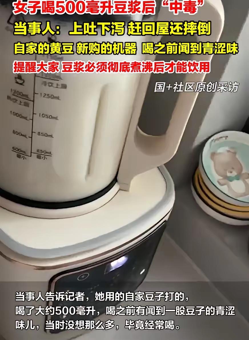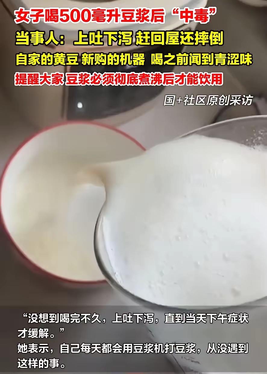 万万没想到!江苏南通,女子新买了一个豆浆机,早上起来用自家豆子打完豆浆后喝了500ml,喝之前就闻到一股青涩味,但她并没在意,可没过多久就开始上吐下泻,最惨的是往家跑时还直接在路上摔倒。网友:最后摔这一下估计拉裤兜了 这位南通女子跟记者说,她喝豆浆喝了好些年,豆子都是自己家种的,豆浆机也是刚买的新的。喝之前就闻着豆浆有股生豆子的青涩味,不过觉得豆浆机标着“免煮”,就没当回事,直接喝了500毫升。 刚喝下去十来分钟,她就开始反胃吐了,接着肚子又疼又拉。想跑回屋里上厕所,结果走到巷子口,腿一软就摔在水泥地上了。邻居看到了过来扶她,当时那场面,别提多尴尬了。 其实这事儿不怪豆子也不怪豆浆机,是豆浆没煮熟的问题。生豆浆里有皂角素和胰蛋白酶抑制剂,这两样东西没被高温煮透,喝进去就容易让人上吐下泻。有些豆浆机只是把豆子磨碎,温度没到100℃,豆浆看着热乎,其实是半生的,有青涩味就是没煮熟的信号。 最近不少地方都有人遇上这种事,有人用破壁机打豆浆,没再煮一遍就喝,结果一家人都闹肚子,去医院看了才知道是生豆浆惹的祸。医生说,不管用啥机器打豆浆,打好后都得放锅里再煮5到10分钟,把有害物质煮没了才能喝。 这位女子还算运气好,歇了一下午就没事了。但现实里,有人因为喝了没煮熟的豆浆,症状更严重,还得住院。说到底,就是大家太信家电的功能,忽略了食品安全的基本步骤。 食品安全这事儿,从来就没有小事。就算是天天吃的东西,该按规矩处理也得按规矩来。家电再方便,也不能替我们把食品安全的关。这次的事也提醒大家,用厨房电器做吃的,不能光靠机器,得结合食材的特点做好处理,不然容易出健康问题。 你有没有过用家电做食物时忽略安全步骤的经历?快来评论区分享你的经历和看法!
