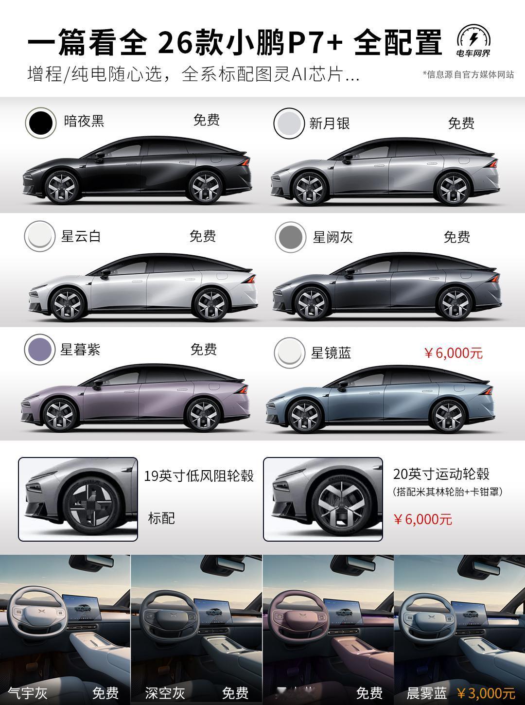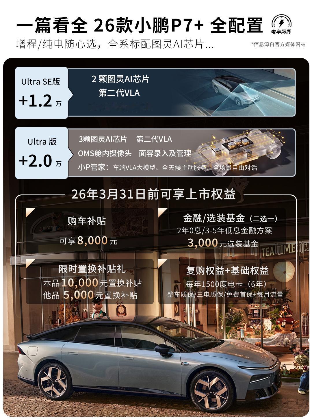2026款小鹏P7+上市,售价18.68-19.88万元。增程版纯电续航430km,综合续航1550km,纯电版续航615/725km,纯电和增程价格相同,油电同价,根据需求来选。 新款p7+全系标配1颗图灵AI芯片,算力750TOPS,还可以选择加钱升级第二代VLA的Ultra SE版/Ultra版,具体版本配置区别以及权益请看图就懂啦~【来自懂车帝车友圈】