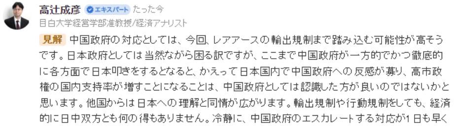 日本见抗议无效,现在开始换套路了。针对中国对出口日本军民两用物项的限制禁令,日本经济专家高辻成彦今天开始“警告”中国了。他说:中国对日本进行限制,当然会造成日本的困扰,但中方如此单方面的打压日本,势必会加剧日本国内对中国的“反感”,进而推高高市早苗的国内支持率。他还强调“中国最好认清这一点”。   可能不少人没太摸清这里面的门道,简单说下背景,中国限制向日本出口军民两用物项,核心就是为了保障自身安全,防止这些物资被用到军事相关的地方,这在国际上都是常规操作,完全是主权范围内的事。   可日本这边,之前光靠抗议施压,喊得再响也没起到半点作用,现在改派专家出来说话了。   这个站出来“警告”中国的高辻成彦,可不是普通路人,既有大学教书的身份,之前还在日本经济产业省待过要职,在政界和学界都有不少人脉。   他这次跳出来说的这番话,看着像是在分析经济影响,实则藏着别的心思。   按照他的说法,中国的限制确实会让日本觉得麻烦,但更严重的是会激起日本人对中国的反感,而这种反感会帮高市早苗拉到更多支持率。   这话听着就有点怪,合着中国维护自己的安全利益,最后还要背上个“推高日本右翼支持率”的锅?   说白了,这就是换了种方式施压,之前是直接抗议,现在换成用“民意反感”“右翼崛起”当筹码,潜台词就是“你们要是不取消限制,以后日本上来个更强硬的领导人,后果你们自己担着”。   这种逻辑真的站不住脚,把自己国内的政治情况,强行和中国的正当举措绑在一起,本质上就是一种变相的勒索。   高辻还特意提了一嘴,说中国这么做会让日本在国际上被同情,把自己扮成受害者。   可他压根没提最关键的一点,中国出台限制措施,是为了防患于未然,避免物资被滥用,这既符合国际惯例,也没做错任何事。   其实仔细想想,他说这话的时候,也暴露了日本一些精英的真实心态。动不动就提民众反感、右翼支持率,本质上还是心里没底。   毕竟这么多年来,日本在历史问题上一直没彻底清算,现在中国越来越强,他们潜意识里怕的是总有一天要为过去的所作所为负责。   所谓的“民众反感”,更像是用来掩盖这种不安的借口。   退一步说,就算真有部分日本人对这事有看法,那也不是中国的问题。   这些年日本在涉台问题上频频挑衅,还一个劲搞军事扩张,这些举动早就让周边国家不满了。   现在中国只是采取正当的防御措施,他们倒好,反而倒打一耙,怪起中国来了。   要是真像高辻说的那样,担心中日关系恶化、担心出现双输的局面,他更该去劝劝日本政府,而不是来“警告”中国。   别再搞那些试探红线的操作,好好遵守之前达成的政治共识,这才是解决问题的关键,靠威胁、靠卖惨,根本不可能让中国在核心利益上让步。   大家对此怎么看?欢迎评论区留下您的观点!