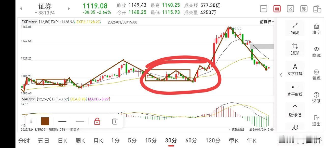 证券板块复盘(2026.1.8) 今天下午,证券板块虽然还是延续了一个下跌,但已经进入阶段性底部区间,从5分钟图一上看,目前正在完善5分钟下跌中枢结构,待结构完整后,还会进一步下探,但下探空间有限,在进入下方30分钟中枢区间后如图二,就可考虑再加二成仓位,即总共七成仓位。介入后耐心等待反弹,预计会回补上方缺口,然后根据实际走势再决定是否进行减仓操作。 总体而言,短期的震荡整理并不会改变它的上涨方向,至于中间的波动可用来做点差价,即便差价不成功,也无伤大雅,因为方向是向上的,并没有大的风险。证券板块动态 券商股如何筛选