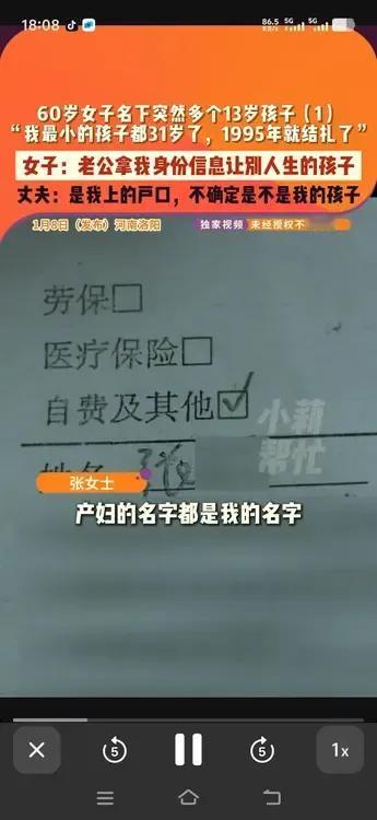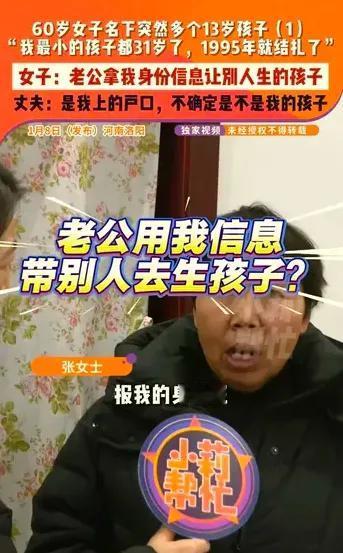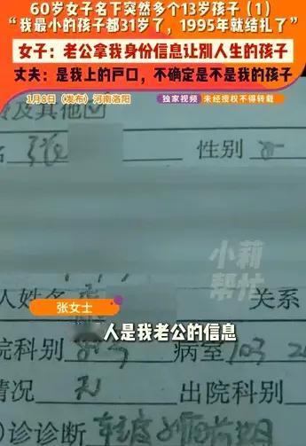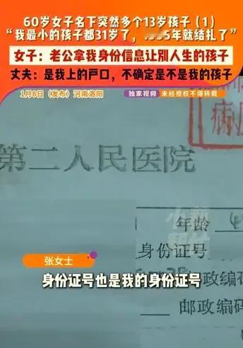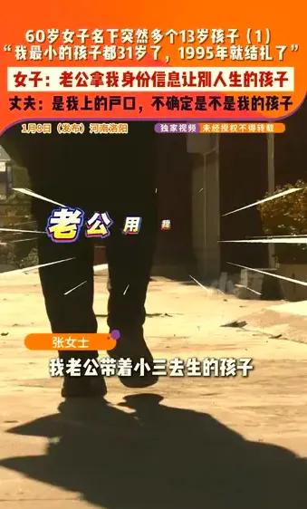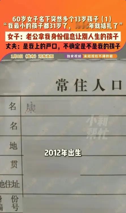 离了大谱,60岁女子户口本里面多了一个13岁的儿子,原来是老公和第三者的私生子。她老公和一个卖保险的女人,一来二去发生了关系,生了儿子,偷拿老婆的身份证。办了户口,还办了出生证明。 这位女子说我1995年就结扎了,我最小的孩子都31岁了。 现在那边13岁的小男孩已经在上学了。卖保险的女子也不见了踪迹。小孩的户口有可能会被注销。