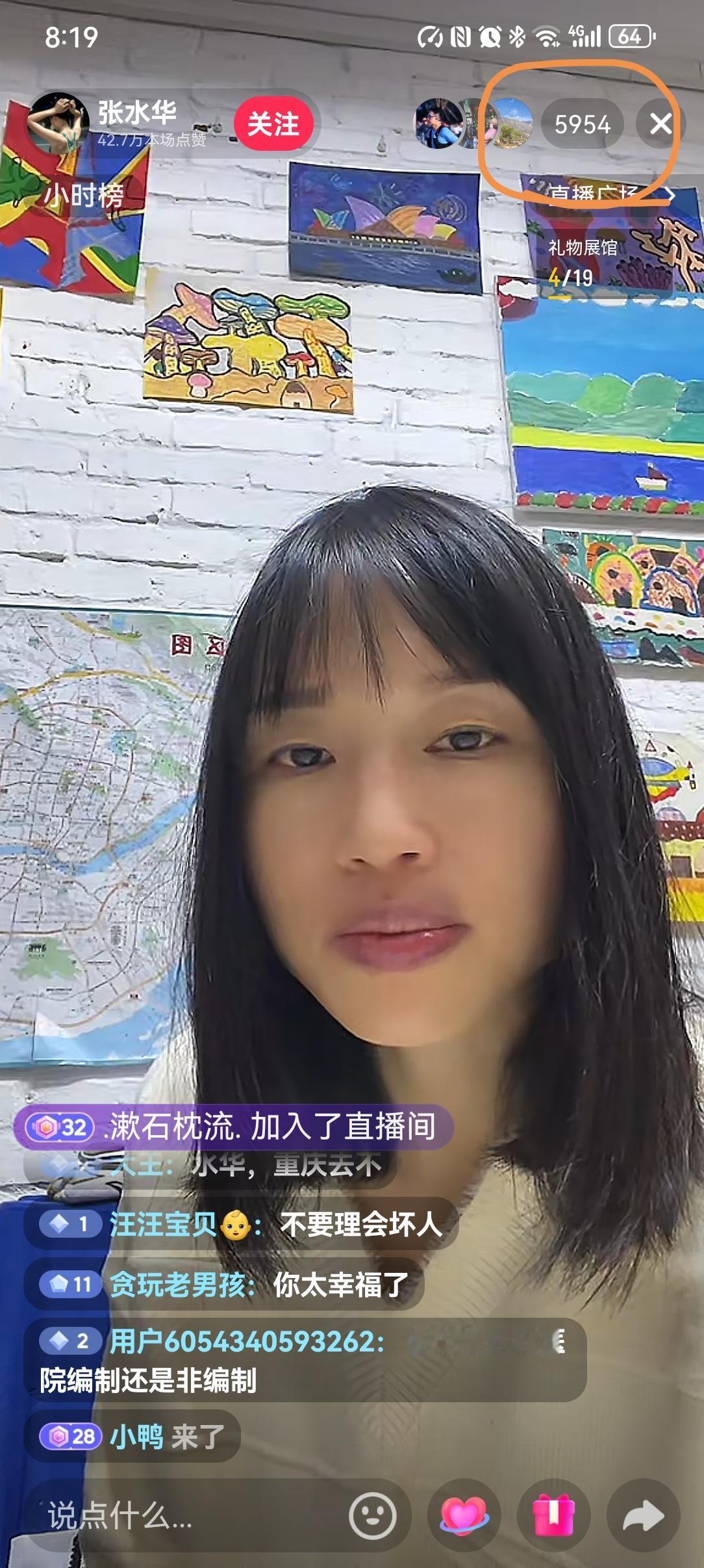 张水华真的辞职辞对了,因为她已经可以吃互联网这碗饭了。 今天她在直播,直播间接近6000人,旁边有一个男的在讲,没有露脸,估计是她老公。 里面不仅仅讲跑马拉松,也还在聊到福建的体育,在聊福建短跑为啥跑不过广东。 有6000人的直播间,已经达到抖音的头部了吧。除了几个大神直播间,常年10万+。其他的一般的头部主播直播间也就几千人。像车模李凉凉和苏宁的直播间,也就几百到一两千人。而马拉松网红李美珍直播,才几百人在线。 怪不得张水华有勇气辞职,因为网红这饭碗,她已经拿稳了。 今天张水华可能洗了澡化了妆,感觉年轻了很多,比跑马拉松的照片显年轻。