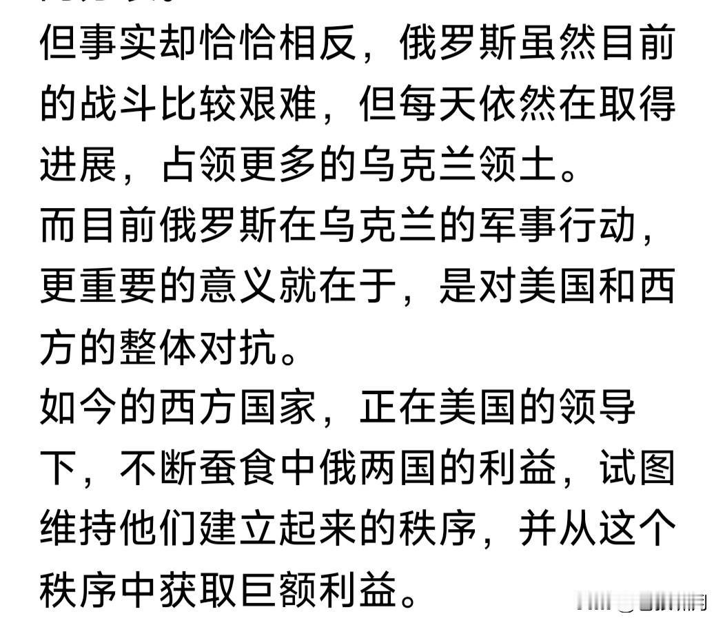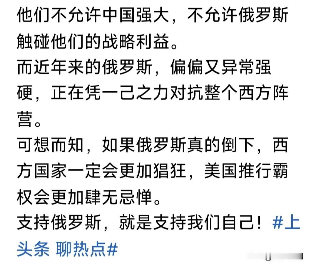 不敢相信,某“时政记者”竟然发布如此言论:俄不能倒下,必须全力支持俄! 因为它是唯一能跟美欧,真枪真刀对抗的国家!目前的俄乌战争就是这样。 西方不允许中国强大!不允许俄碰触他们的利益,他们却损害俄的利益。但俄不信这个邪,偏要与西方对抗到底! 如果俄倒下,西方将更加猖狂,美国将更加肆无忌惮推行霸权!因此我们必须支持俄,支持俄就是支持我们自己! 这是什么言论?俄是在以一己之力,对抗西方世界吗?它不发动战争,会引起西方国家“对抗”吗?什么“一己之力”? 俄对乌发动军事行动,美国率领北约欧盟与自愿联盟,大力援乌保家卫国,是遵守联合国宪章与国际法,维护文明正义与二战秩序,怎说成是打压俄呢? 俄陷入与西方对抗泥潭,与我们有什么关系?中国从不侵略别国,不要别人一寸土地!与各国和平共处合作共赢,竞争关系是不允许中国发展吗? 中国对于俄乌战争的态度是:遵守联合国宪章与国际法,尊重各国领土完整与主权!反对侵略与恐暴,主张政治手段解决矛盾冲突,努力劝和促谈! 你却要我们:全力支持俄罗斯?支持俄就是支持我们自己?这是什么言论?俄因盲目自大错估形势,已经陷入战争泥潭!难道你想让我们也陷进去? 还有俄以“一己之力对抗西方”?你知道苏俄几次要求加入北约,融入“欧洲大家庭”吗?加入不成,就以别人加入为由发动战争,这是否很滑稽荒诞? 最后再问你一句:俄不能倒下,我们必须全力支持俄!这是在替谁说话? 拉夫说:俄若倒下,下一个就是中国! 杜金说:俄若倒下,下一个就是中国! 你一个中国人,为何也要这样说呢? 看你身份是“时政记者”!想起易中天说过一句话:如果文化人无耻起来,比普通老百姓产生的危害更大! 因为普通老百姓,可能看不透事情全局是非曲直!而文化人是能够看透的,看透又胡说八道,想干什么? 只为假话真说圈粉获利,挣几个蝇头小利?还是用心险恶,误国害民,败坏国家形象,陷我们不仁不义? …………