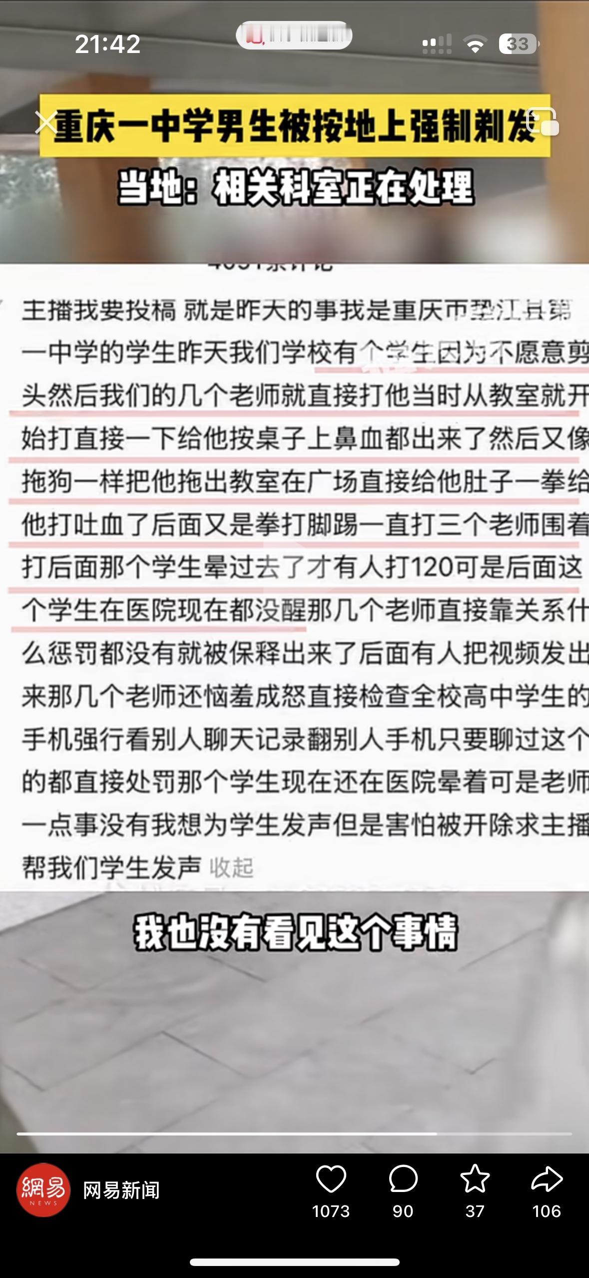 看的让人气愤,简直太过分了!重庆一所学校居然把学生按在地上摩擦,要帮他剪头发 学生爆料说,老师在教室就开始打他,把他按在桌子上打的他鼻血都出来了,这还没完,又把这位学生像狗一样拖出教室给了他肚子一拳头,3个老师围着打他,直到把他打昏过去,才有人打了120,现在这位学生在医院还没醒,老师们却什么惩罚都没有通过关系被保释出来 学生有天大的错也不该是老师们对他拳打脚踢的理由!这样的老师不配教书育人