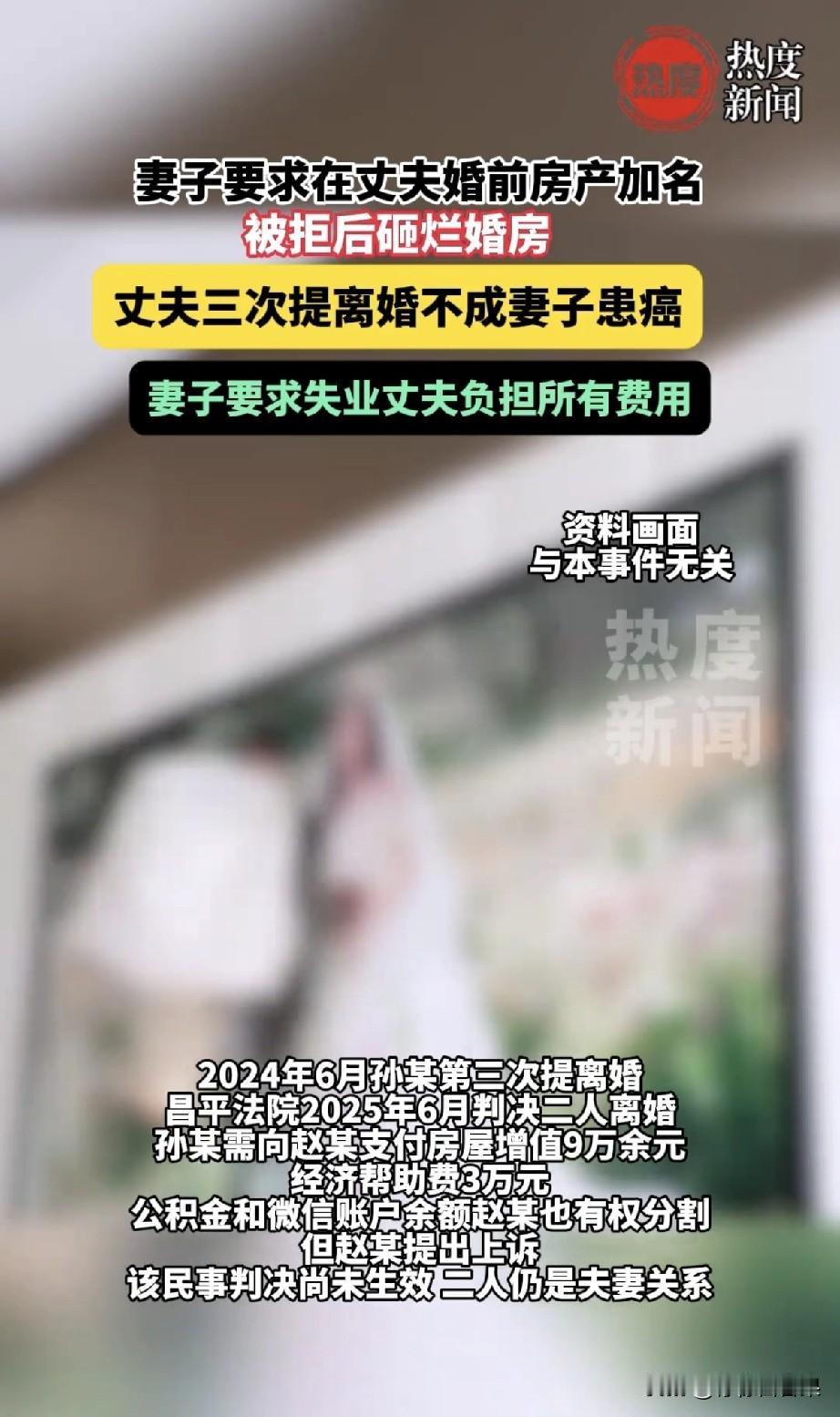 刚刷到这个婚姻纠纷,我直接看呆了。 妻子想在老公婚前房子上加名字,被拒后直接把婚房砸了个稀巴烂;老公三次提离婚都没成,结果妻子查出胃癌,转头就让失业的老公承担所有治疗费,还要一大笔赔偿,这操作我真是看傻了。 这事得从2018年说,孙某和赵某这两口子就开始分居了,婚姻早就没多少情分了。2021年1月,孙某第一次起诉离婚,法院没同意;年底第二次提离婚,还是被驳回。本来关系就僵,赵某又想在孙某婚前买的房子上加自己名字,被拒绝后火气上来,直接把婚房砸了,这下俩人的矛盾彻底闹掰。 更戏剧的是,2022年初赵某查出来胃癌,开始做化疗,病情现在还算稳定。可她转头就跟孙某提要求,不仅要孙某全包治疗费用,还得给未来三年每月4000块的营养费,再加上10万块的离婚赔偿。 但孙某这边也实在难,他失业好几年了,现在一个月挣的还不到4000块,哪扛得住这么大的开销?只能说愿意每个月给1000块,给两年。后来法院审了这事儿,说赵某得癌症不是因为天天做家务累的,而且她是完全能对自己行为负责的成年人,所以她要的那些高额费用,其实没啥合理依据。 在我看来,这事儿里俩人都挺拧巴的。赵某加名被拒就砸房子,明显是太冲动了,好好的家砸了,问题也没解决,反而把关系搞得更僵。她得癌症确实让人同情,但也不能不管老公的实际情况,张口就要这么多钱,换谁也扛不住啊。 孙某三次想离婚都没成,估计也挺憋屈的。婚姻走到这步,本来就该好好谈,要么好聚好散,要么按法律来算清楚财产和责任,靠极端行为根本没用,最后只会让俩人都身心俱疲。说到底,婚姻里不管有啥矛盾,理性沟通才是正经事,耍脾气、提过分要求,根本解决不了问题。