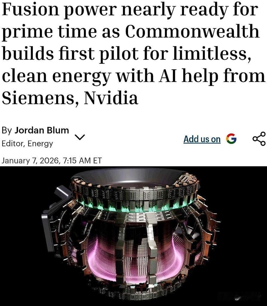 附图为美国联邦聚变系统(CFS) 的SPARC核聚变示范反应堆,目前,CFS正与西门子和英伟达合作,利用他们的技术创建一个“数字孪生”反应堆,以期将实验时间从几年缩短到几周。 联邦聚变系统(Commonwealth Fusion Systems,CFS),一家麻省理工学院的衍生公司。 项目: SPARC,一个旨在证明净能量输出(产生的能量多于消耗的能量,Q>1)的紧凑型高温超导磁体聚变装置。 合作伙伴: 西门子(提供工业软件)和英伟达(提供AI和模拟平台)。 技术应用: 利用英伟达的Omniverse库和西门子的Xcelerator平台,创建SPARC的“数字孪生”——一个虚拟副本,用于运行模拟、测试假设和快速数据分析。 进展与目标: CFS于2026年1月6日在CES展会上宣布安装了SPARC的第一个磁体。SPARC预计在2026年产生首次等离子体,并在2027年实现净能量输出。其后续商业发电厂ARC计划于2030年代初并网发电。 CFS的目标是通过使用先进的高温超导磁体技术,实现更小、更经济的聚变能源系统,为电网提供无限、清洁的电力。