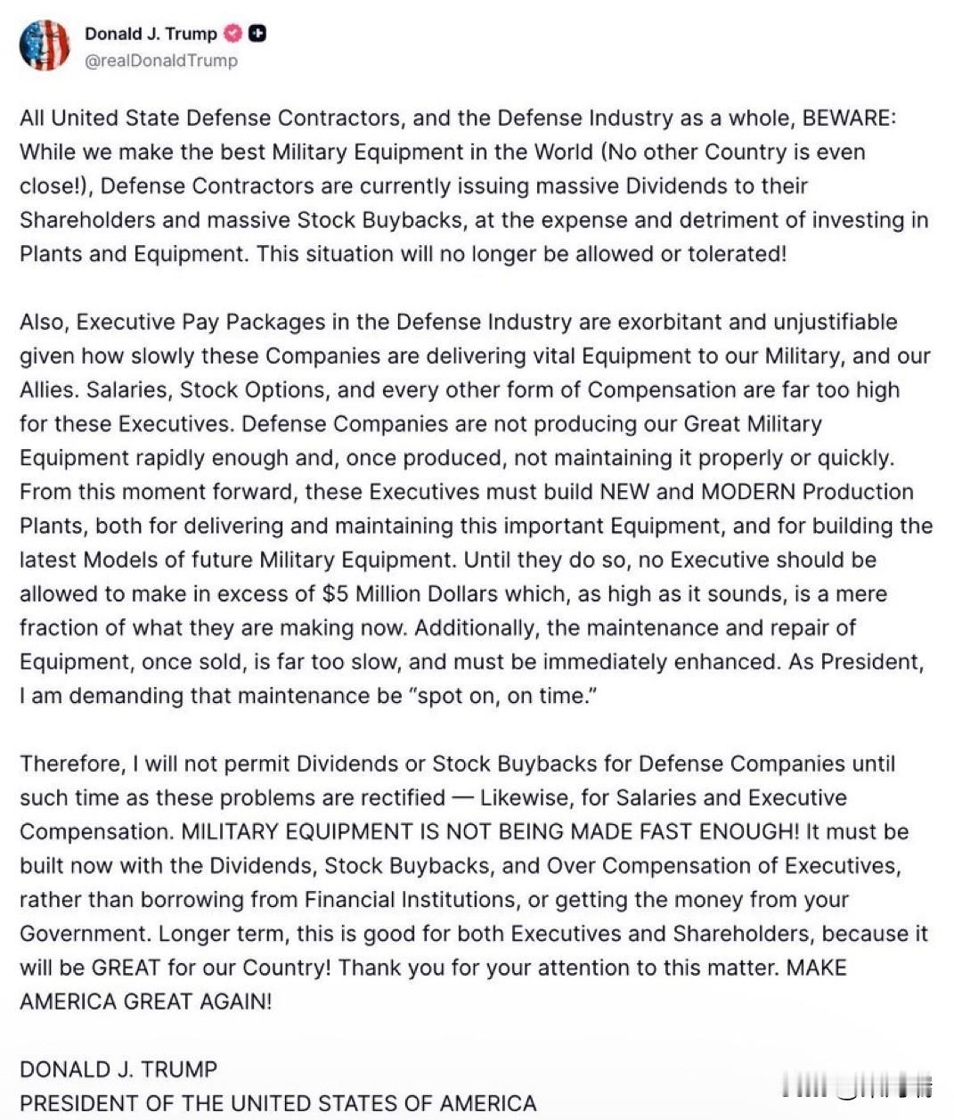 特朗普势头正猛。他对军工复合体的打击力度前所未有,其他任何一位总统都未曾做到。 他禁止国防承包商(例如洛克希德·马丁公司、雷神公司等)进行股票回购和分红。 他还设定了每年500万美元的工资上限。 他强迫他们投资工厂和生产。 这是重振美国工业化的一个非常明智的举措。或许应该将这一做法推广到所有制造企业。