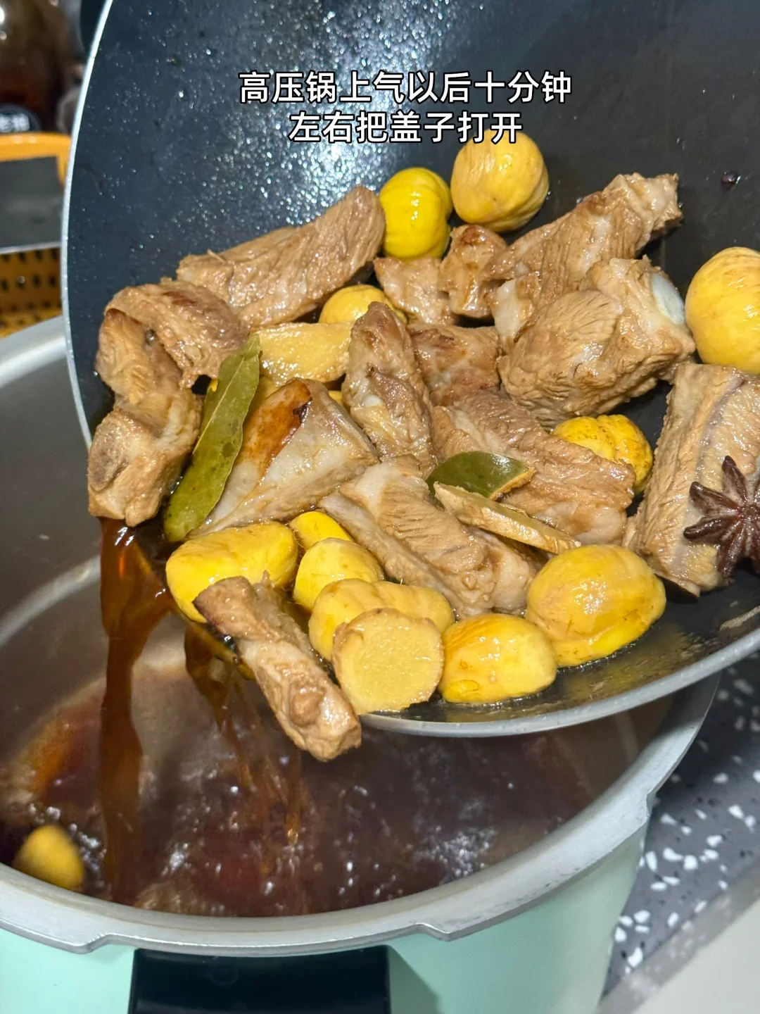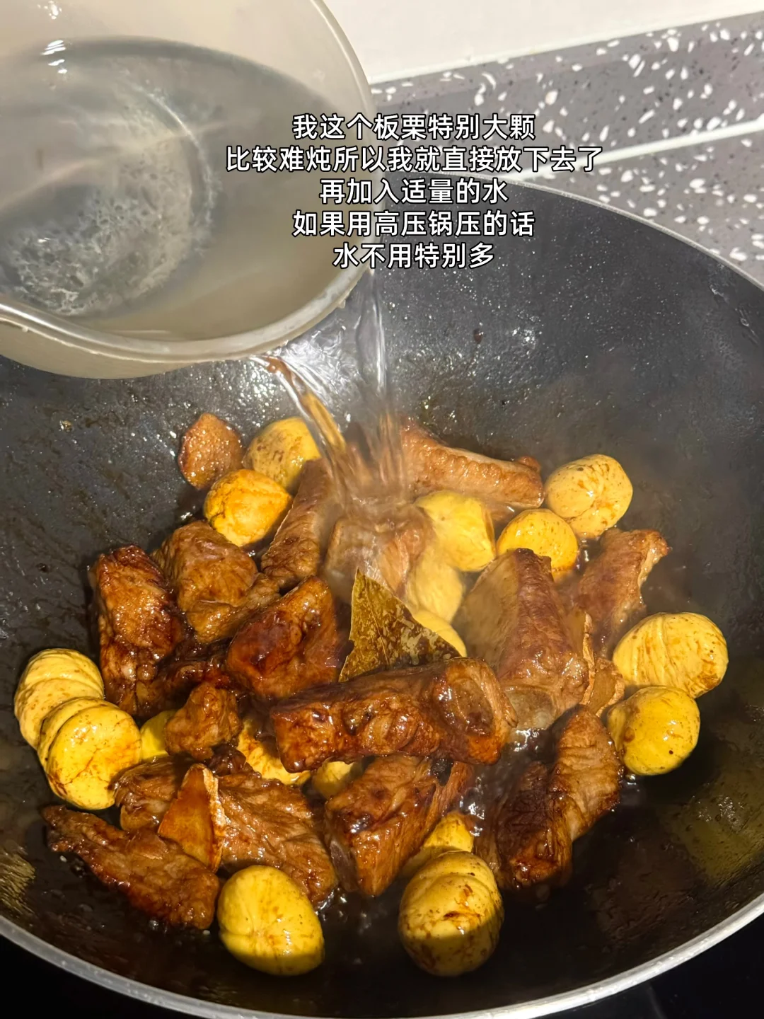 6. 我这个板栗特别大颗比较难炖所以我就直接放下去了再加入适量的水如果用高压锅压的话水不用特别多