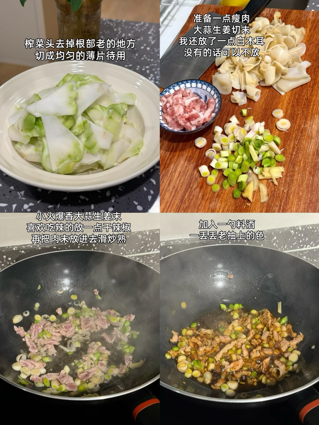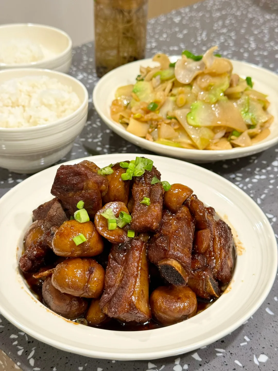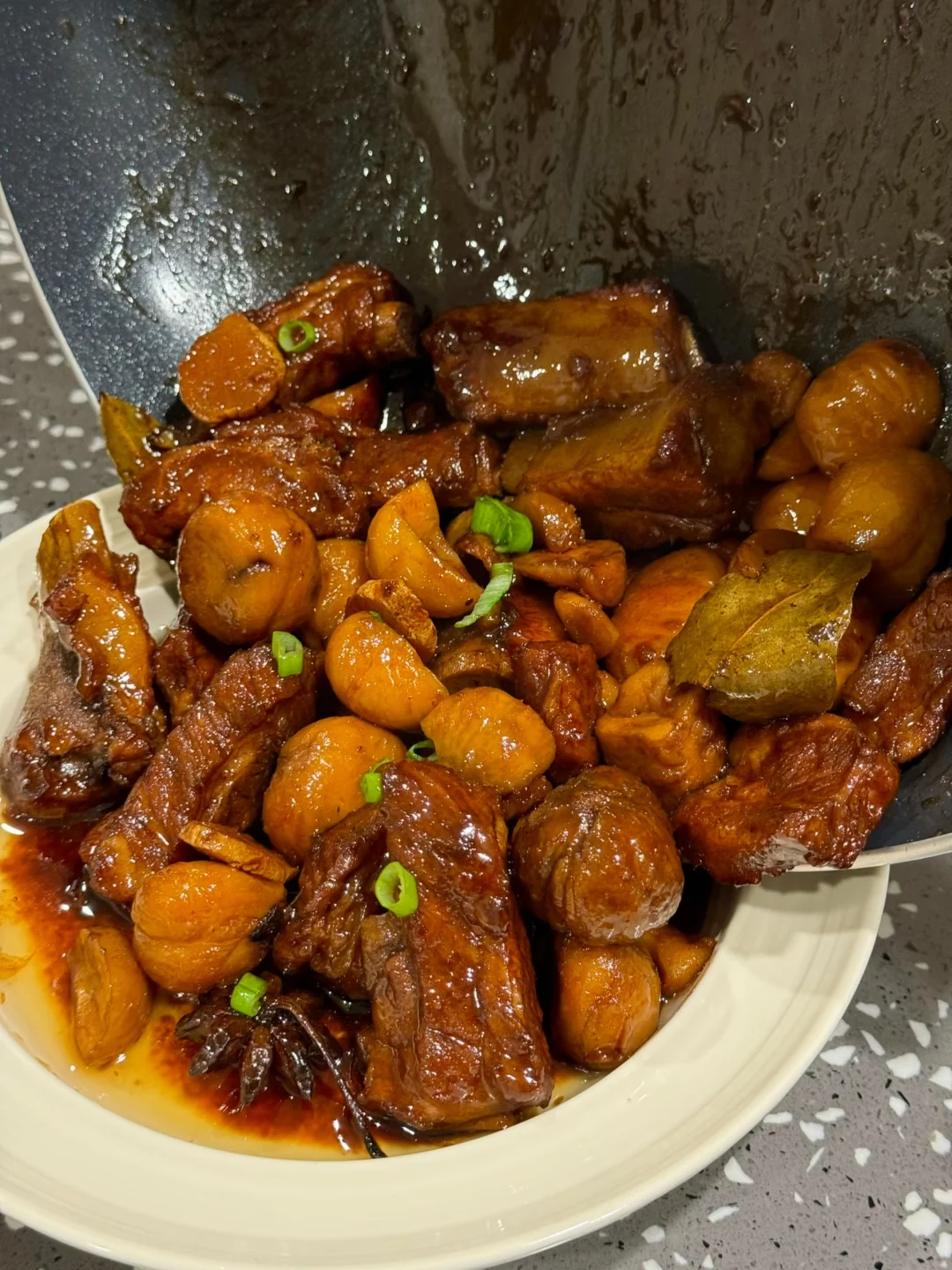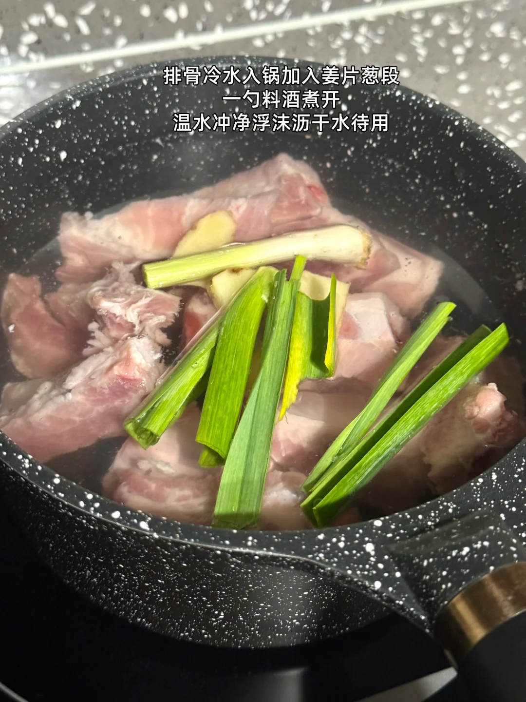 1. 排骨冷水入锅加入姜片葱段一勺料酒煮开温水冲净浮沫沥干水待用